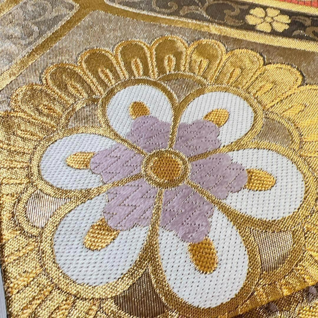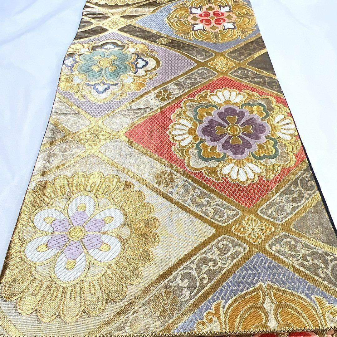 蜀江文に華紋が織られた袋帯です。ブラウンがかった深みのあるグリーン地にパステル調の二色と金の蜀江文の中に煌びやかな華紋が大きく美しく映える一本です。