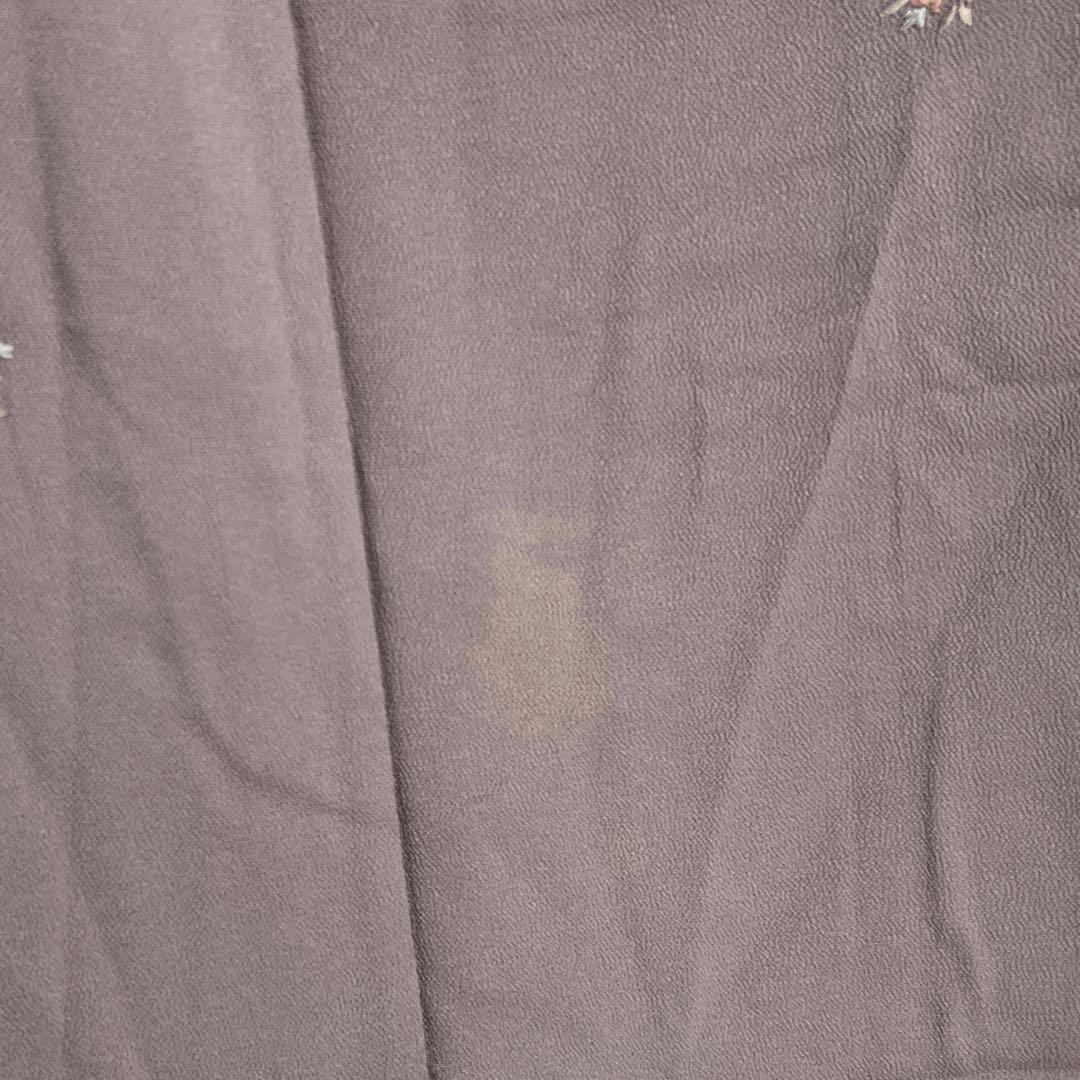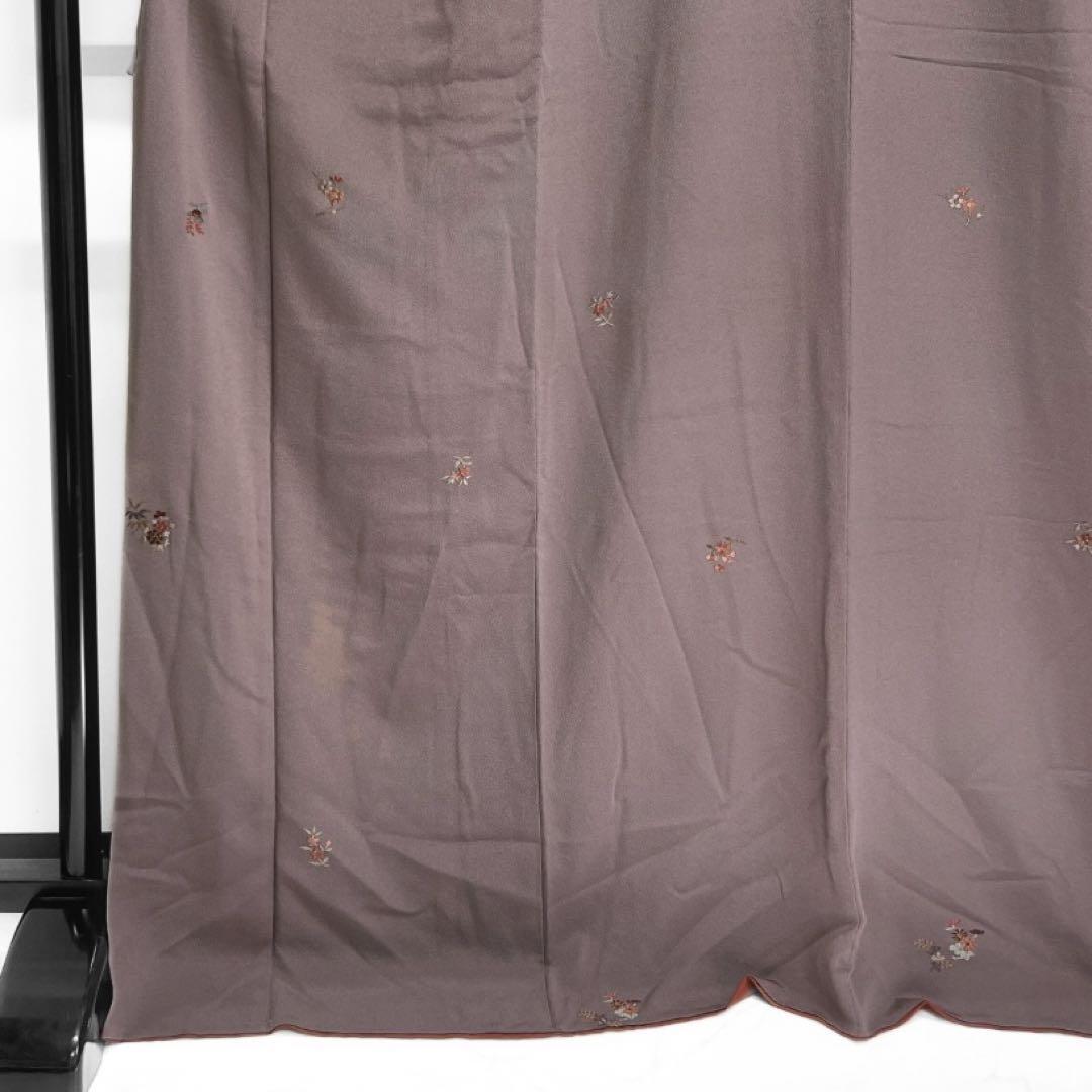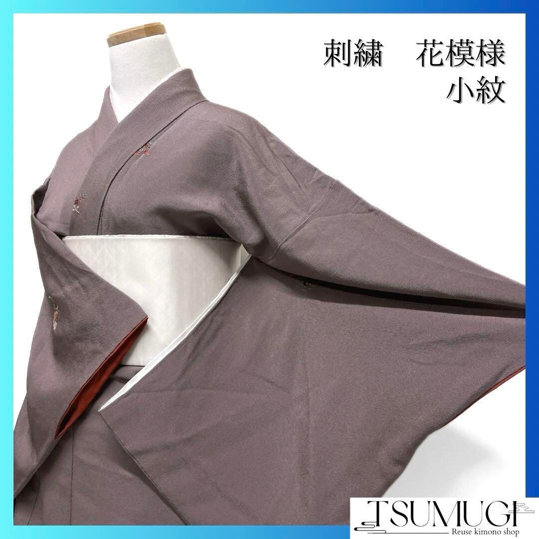 くすんだ紫の地に刺繍で織られた様々な花模様が織られたお洒落な一着です。