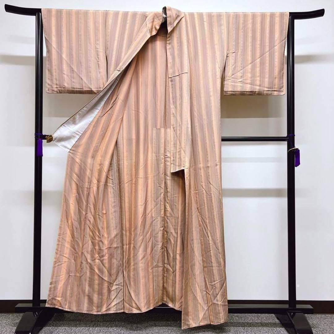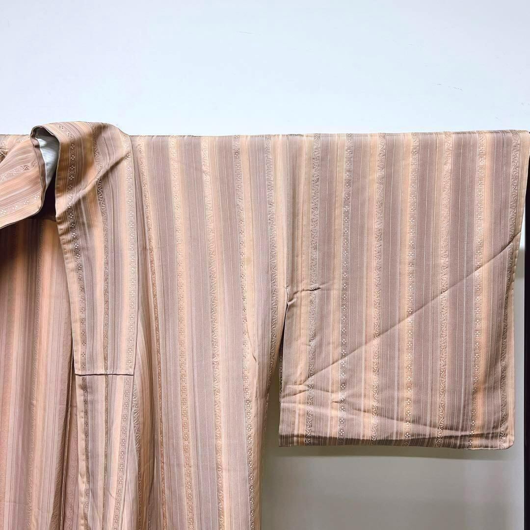 オレンジとブラウンの縦縞模様にその中に描かれた文様がお洒落な一着です。