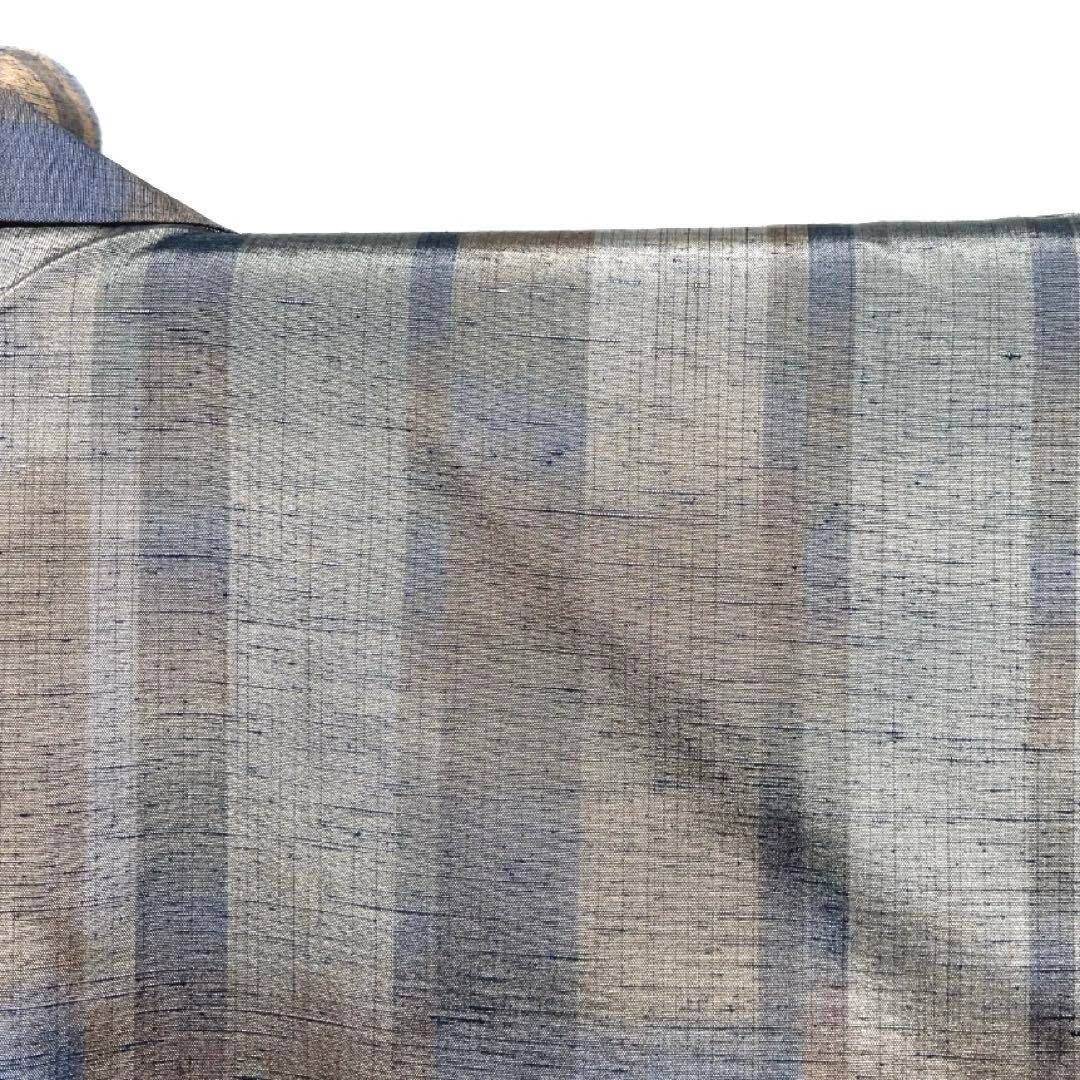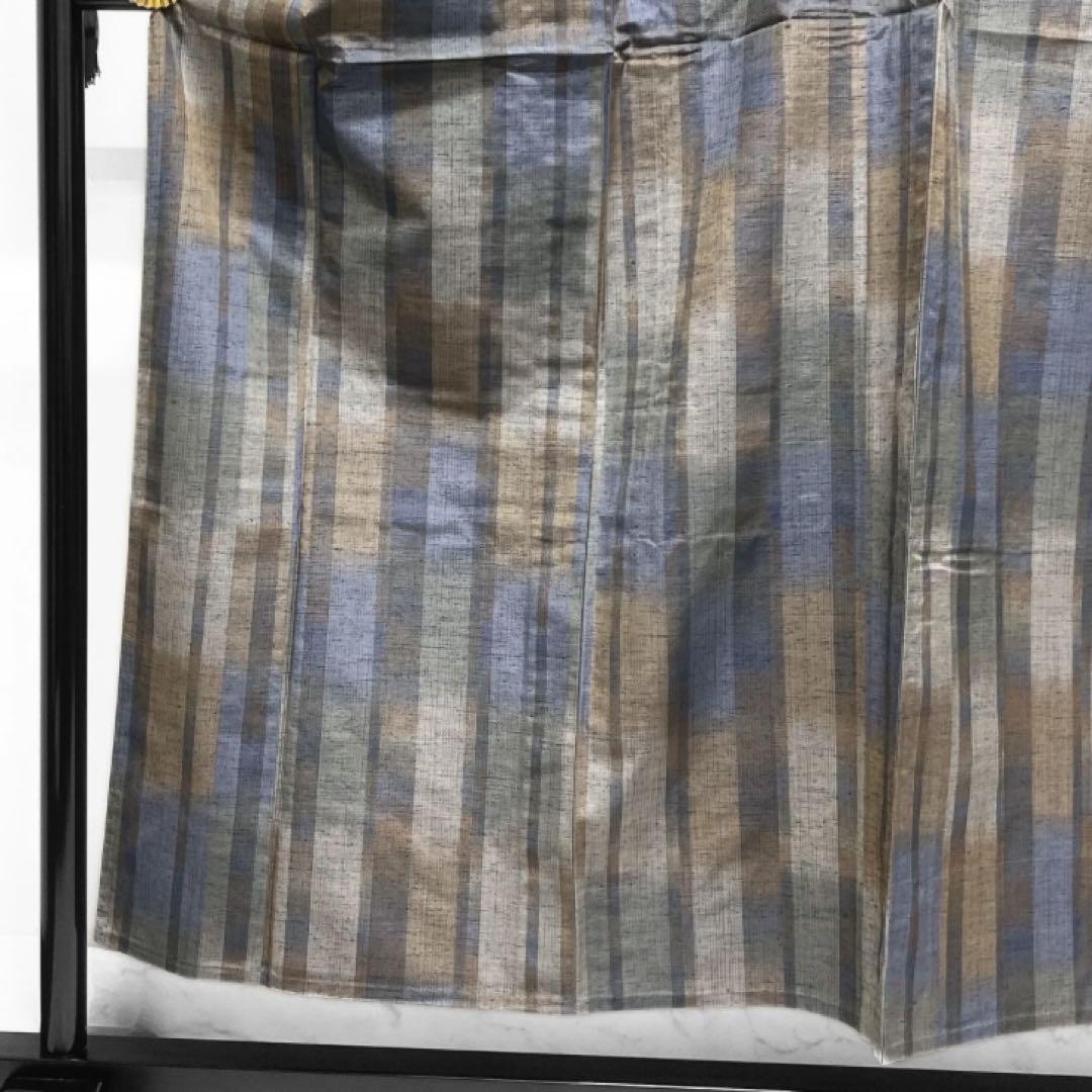 縦縞に変わり格子のような文様にくすみカラーのブルーやオレンジ、ベージュのグラデーションの文様がお洒落なデザインの一着です。