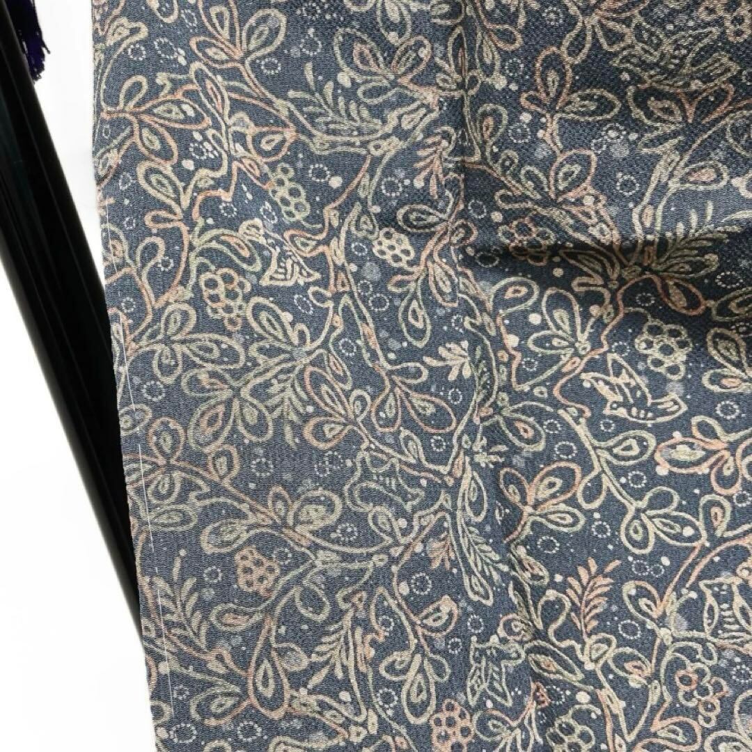 くすみのブルーのちりめん地に描かれたリーフと葡萄の文様に梟や鳥、動物文様が可愛らしく描かれたお洒落なデザインの一着です。
