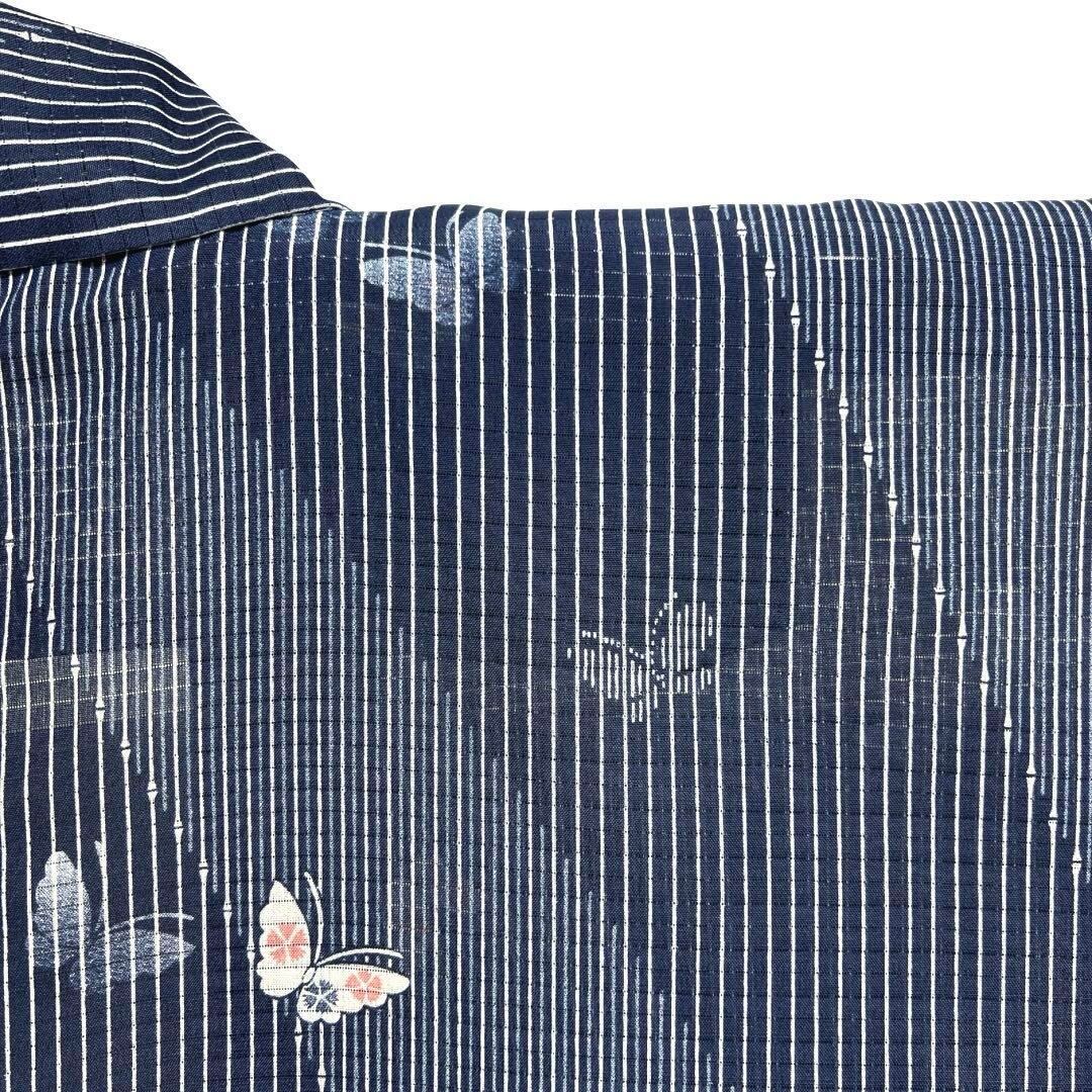 ネイビーの地に斜め縞と竹筋に蝶と撫子の文様がお洒落なデザインの一着です。