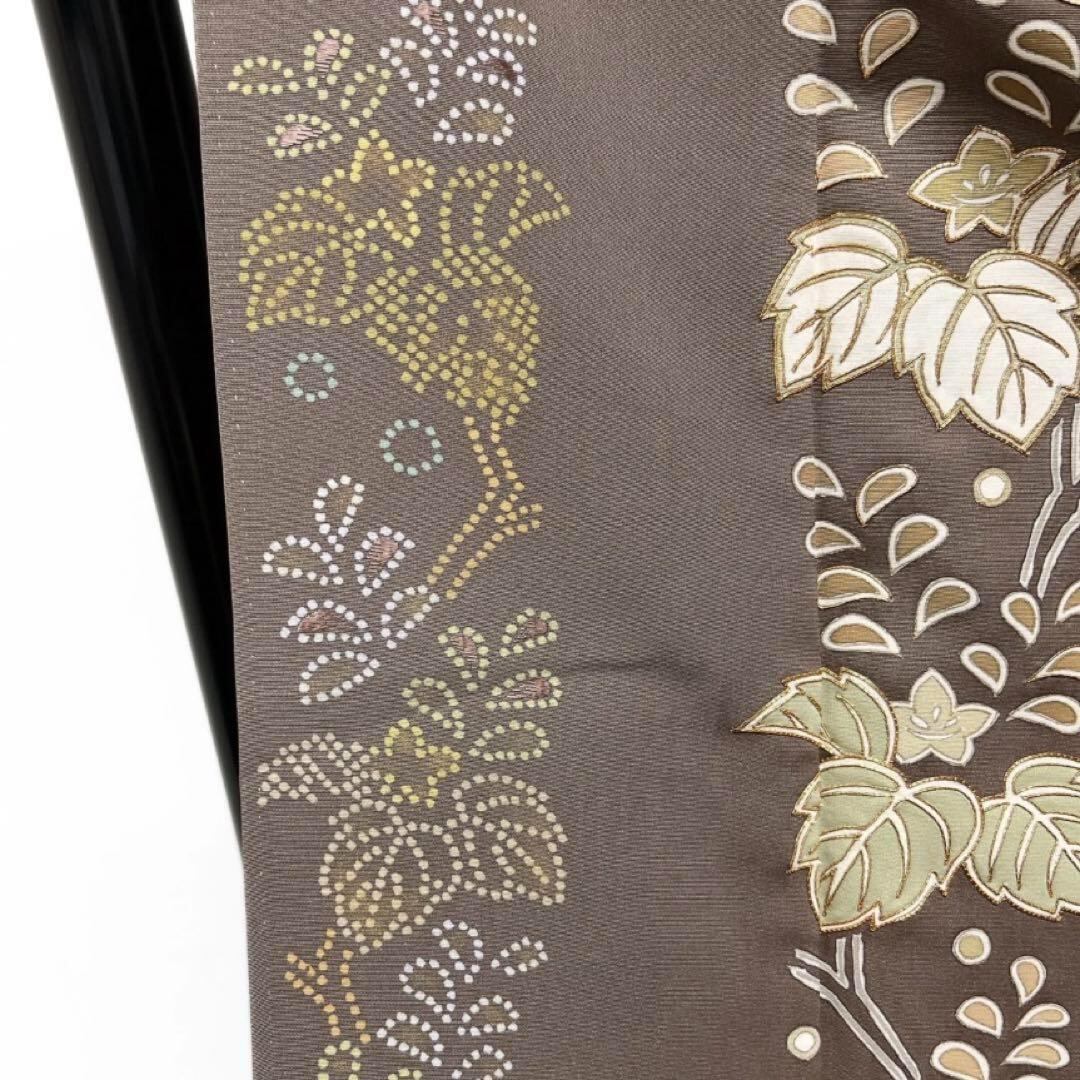 くすんだブラウン地に縦縞と金駒刺繍を交えたリーフと桔梗、萩の文様がお洒落なデザインの一着です。