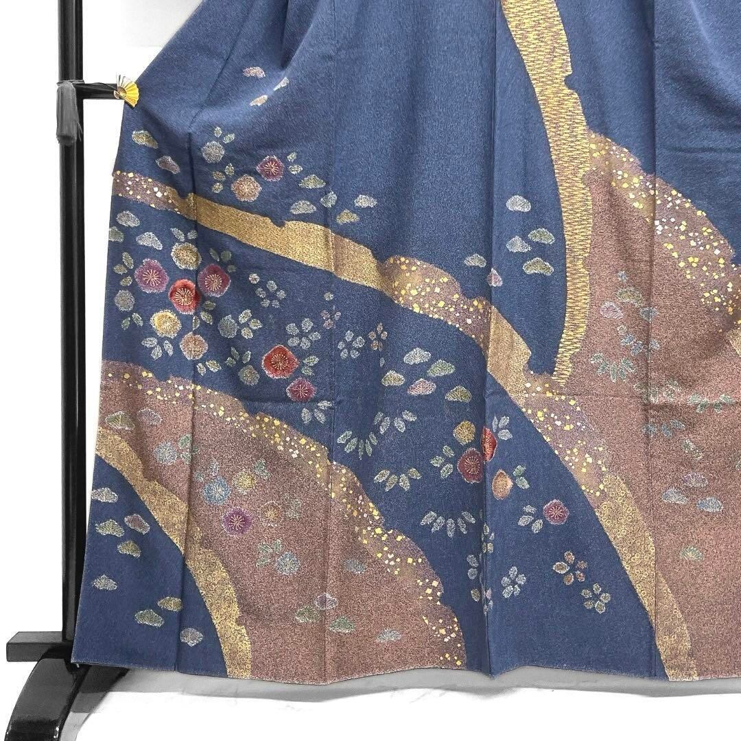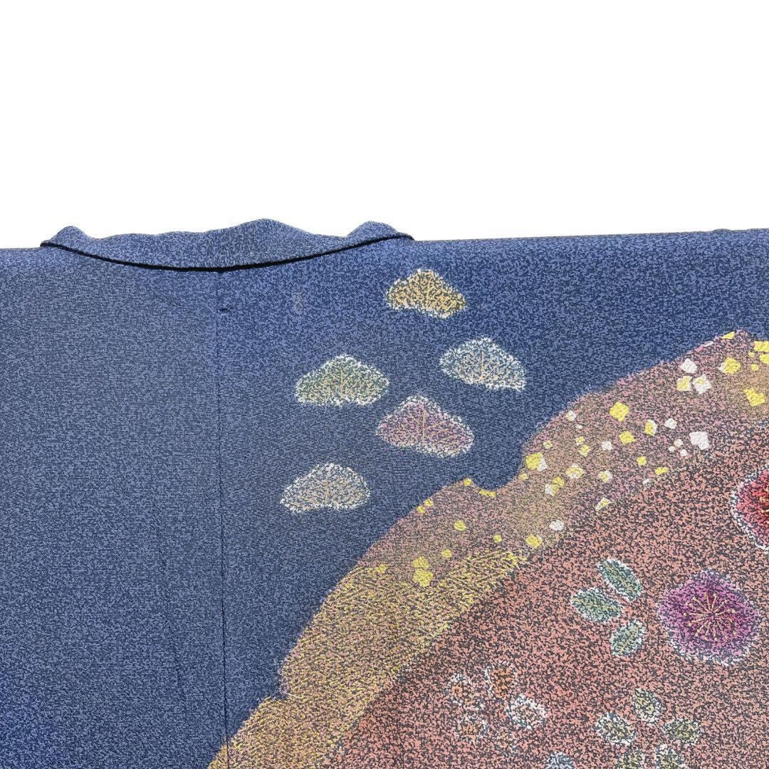 くすみブルーのたたき染地に金彩を交えて描かれた雪輪に色紙散らしと紗綾形、松竹梅の文様が華やかなデザインの一着です。