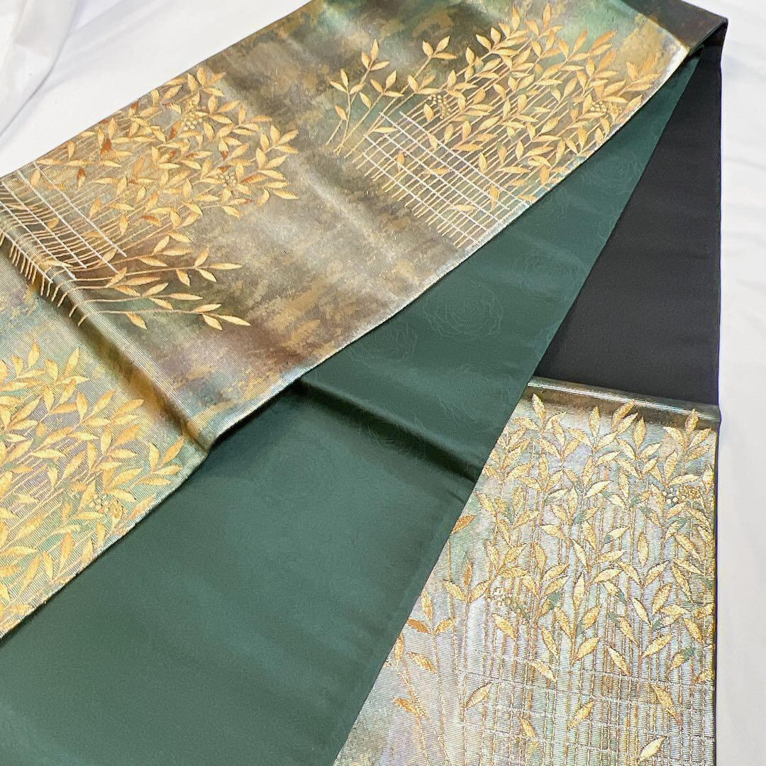 金色の植物模様が織られた袋帯です。