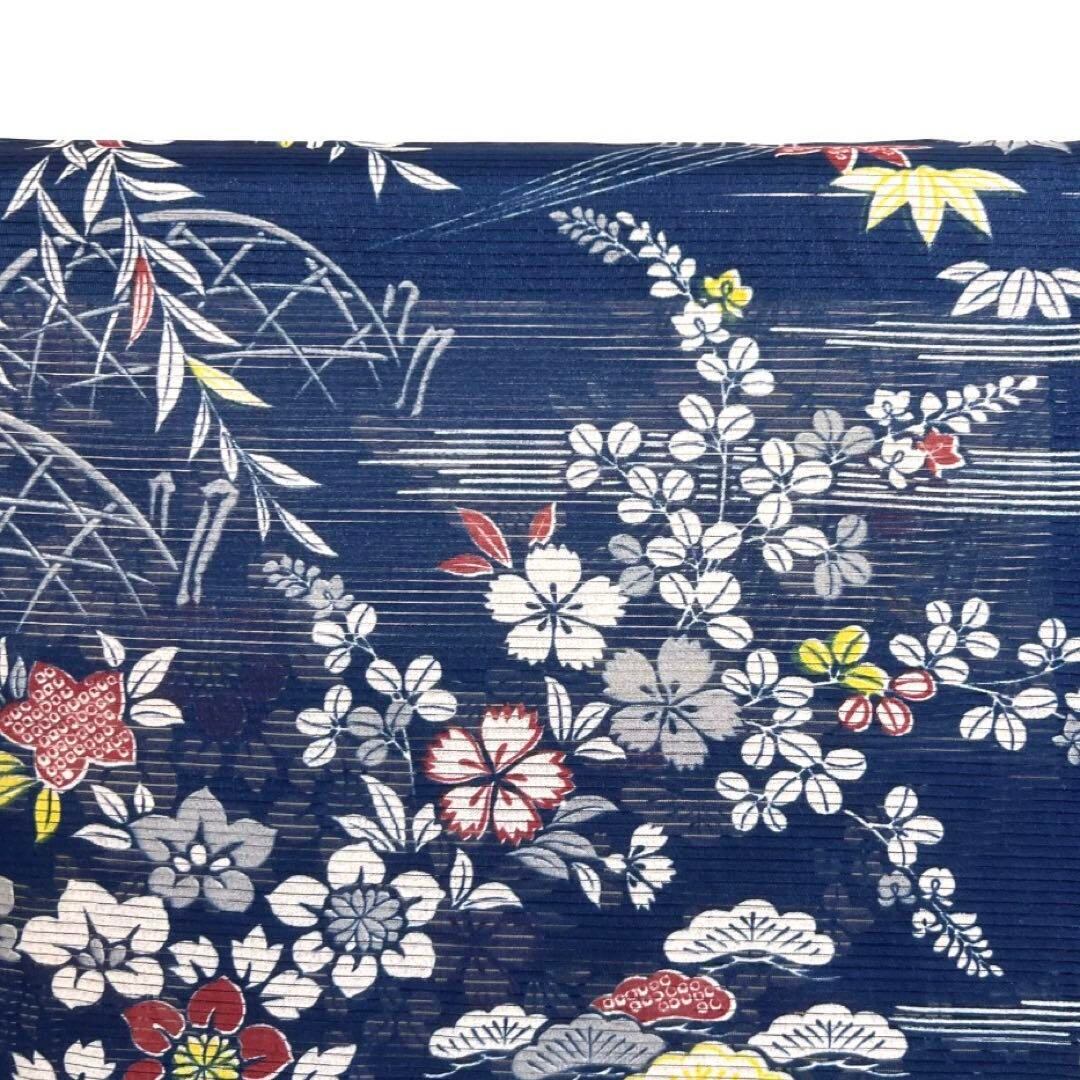 深いブルーの絽の地に映える流水に蛇籠や松竹、鉄線花や萩、桔梗に撫子が描かれた華やかなデザインの一着です。
