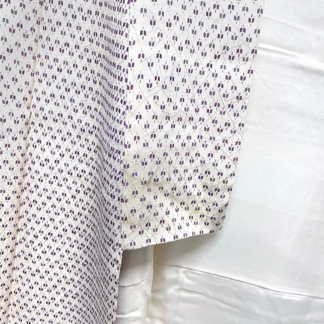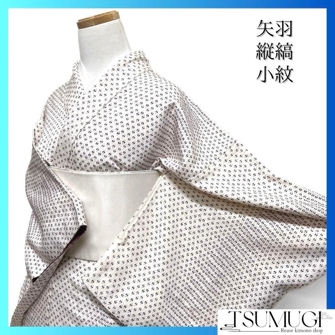 流線地紋の白地に縦縞のように描かれた細やかな矢羽の文様がお洒落なデザインの一着です。