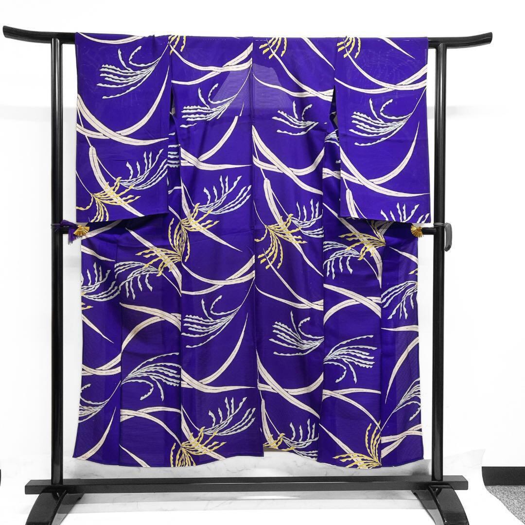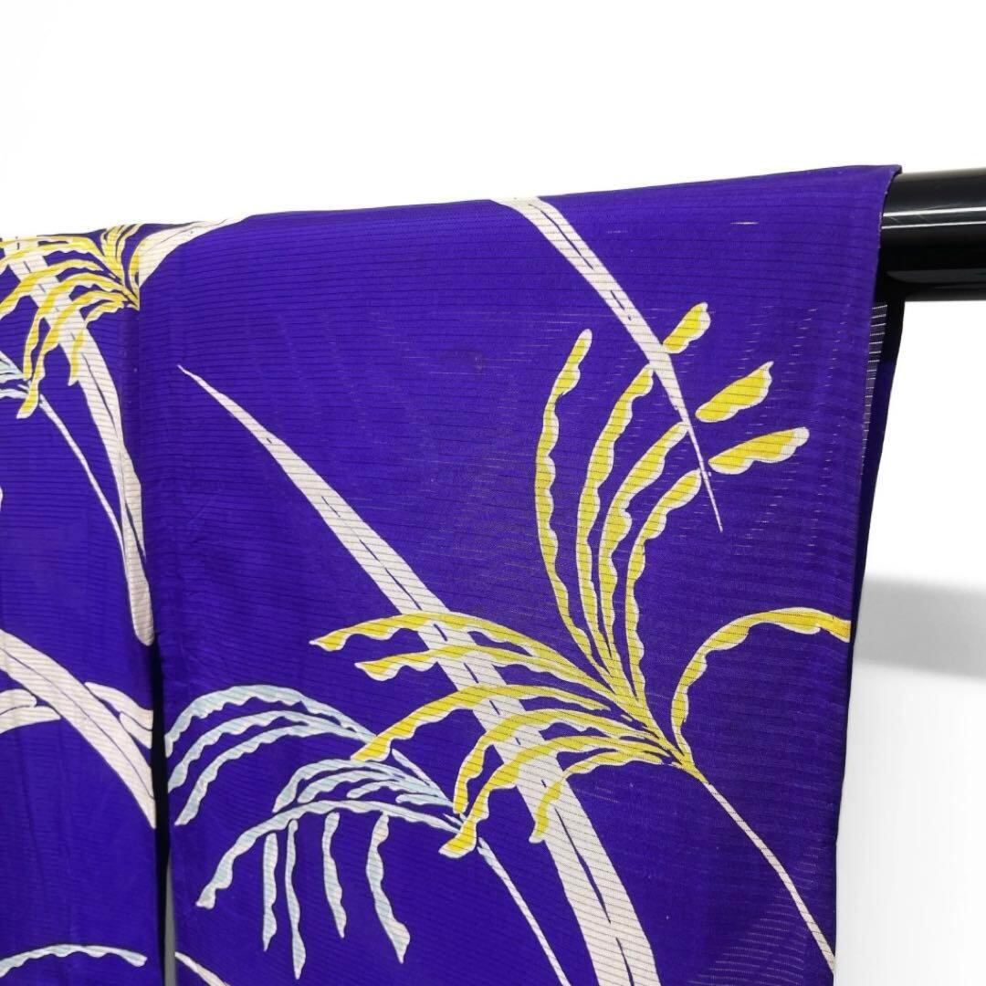 パープルの絽の字に映える稲穂の文様と芝草の文様が描かれたお洒落なデザインの一着です。