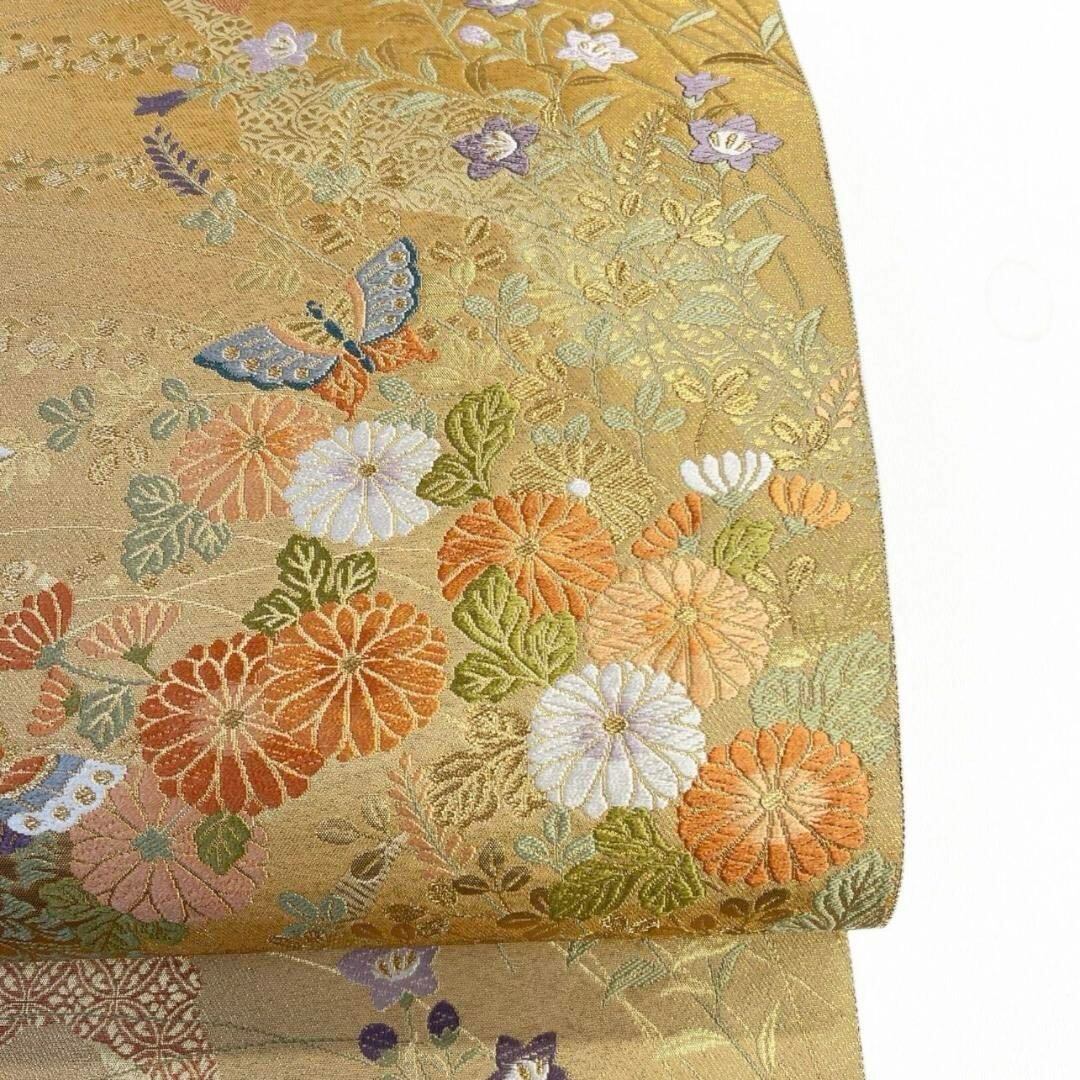 唐織で桔梗や菊花、藤の花、七宝、蝶が細やかに織り出された袋帯です。
