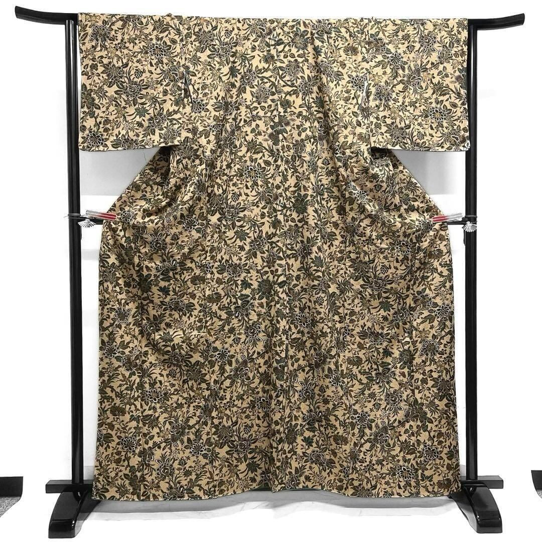 ベージュの地に金彩で縁取れて描かれた唐花文様と花模様が華やかでお洒落なデザインの一着です。