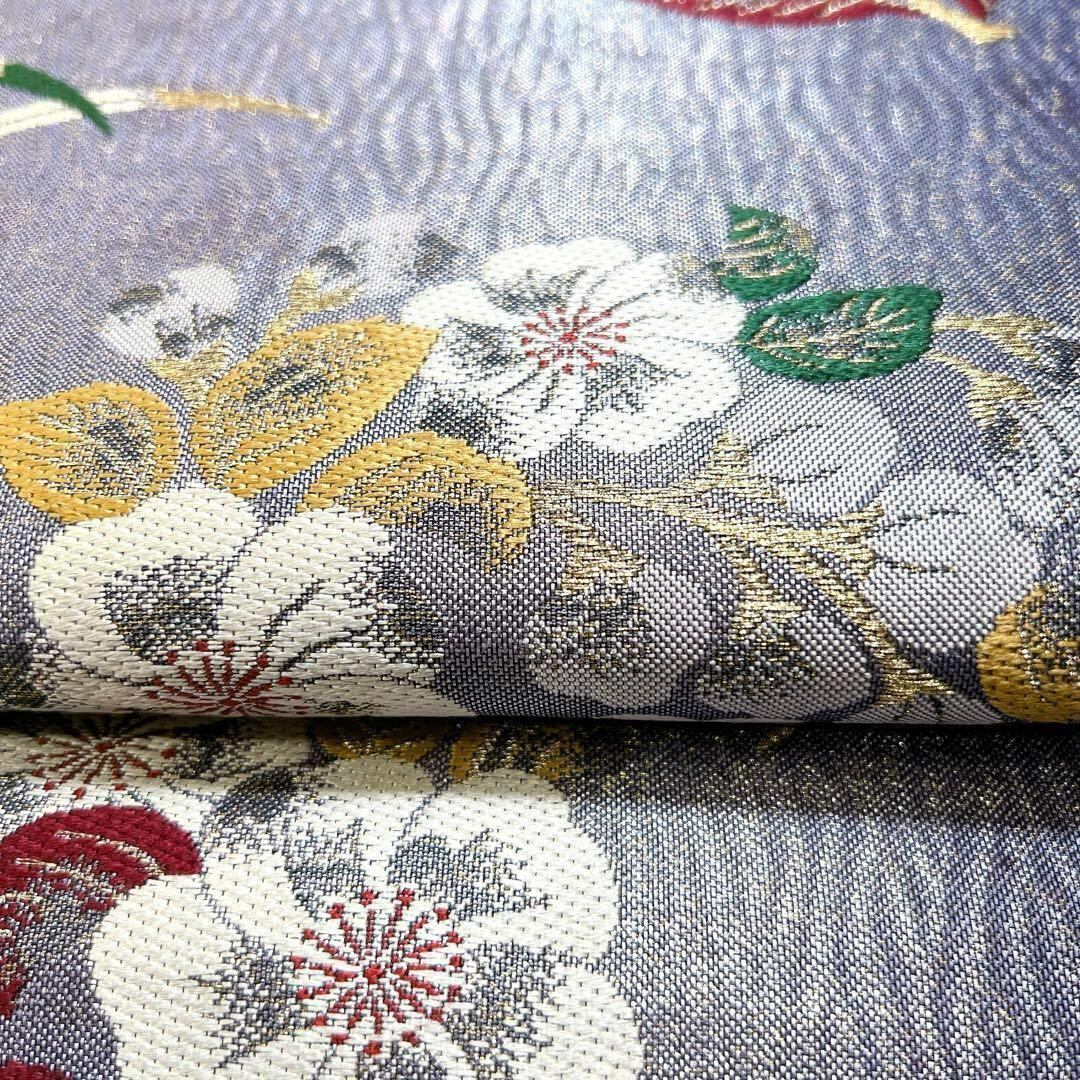 薄紫のグラデーション地に桜模様が織られた袋帯です。