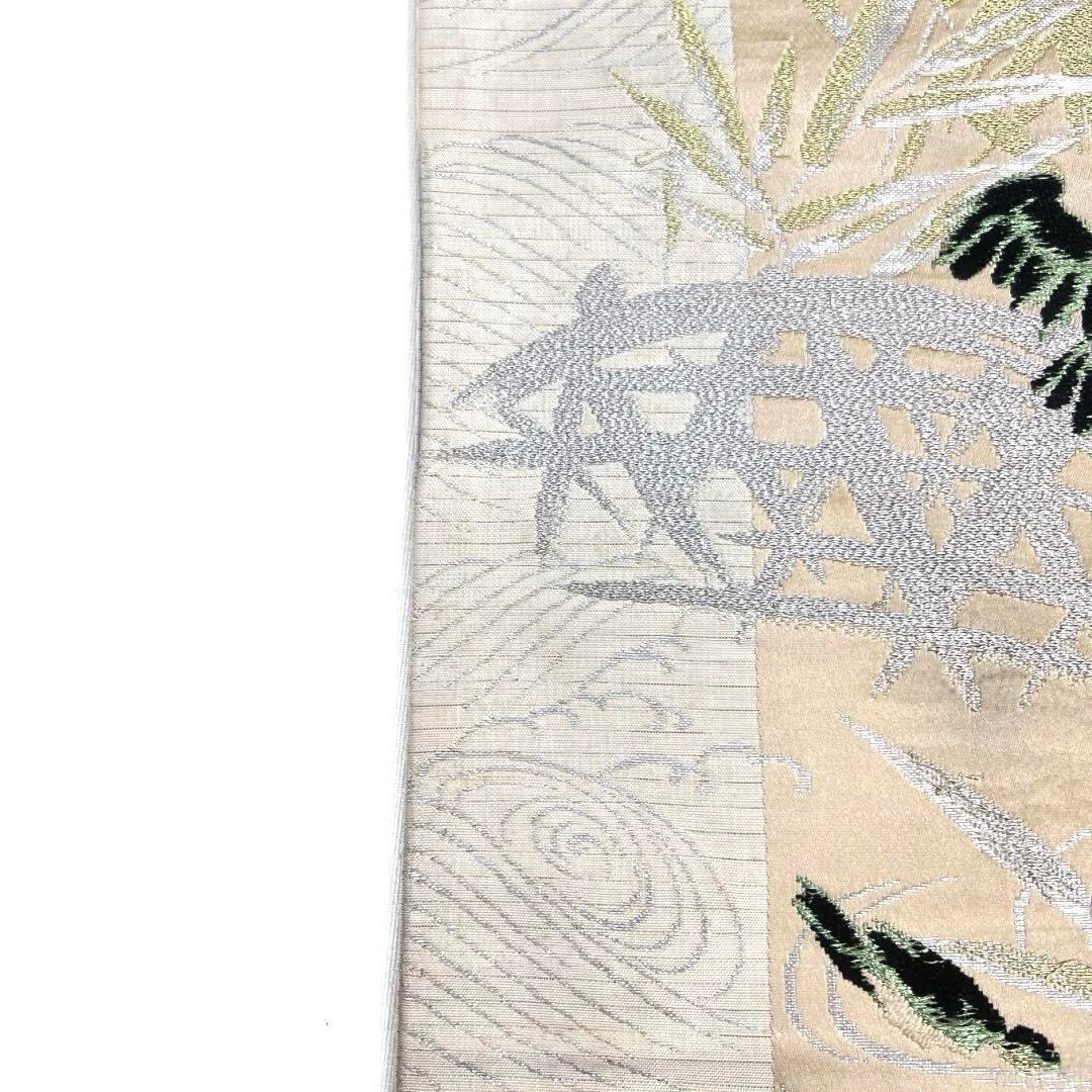ブルーとベージュの縦縞に流水と波に葦の文様と蛇籠に鳥の文様が織られたお洒落なデザインの一着です。