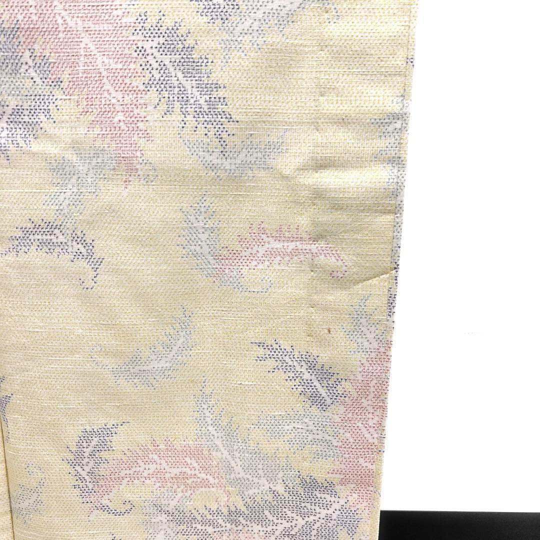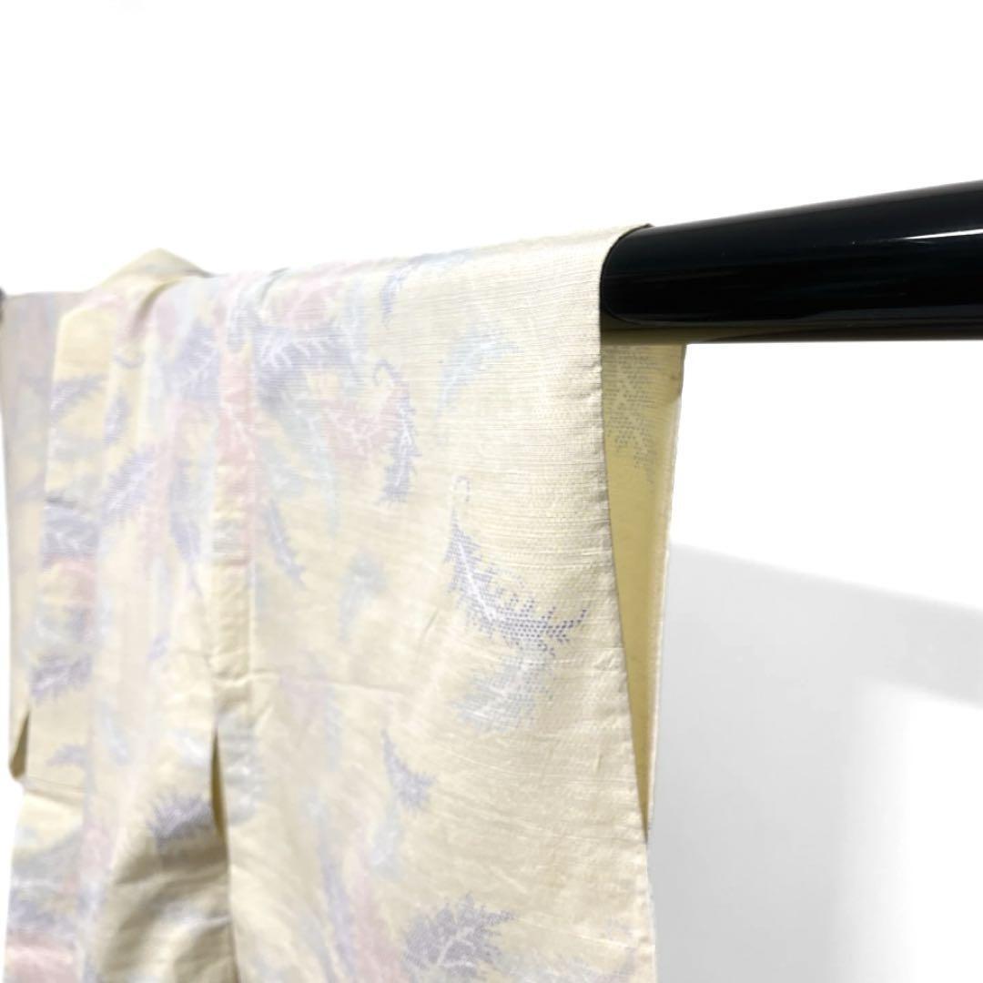 薄く淡いイエローの紬地に淡くカラフルに織られた羽の文様がお洒落なデザインの一着です。