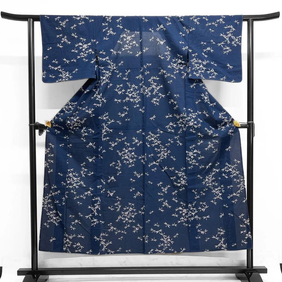 涼しげな綿絽のネイビーの地に映えるトンボの文様が描かれたお洒落なデザインの一着です。