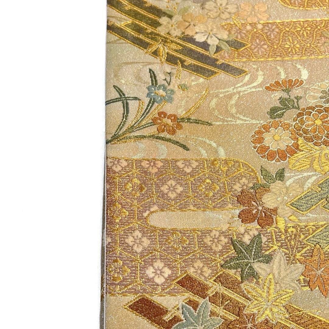 観世水とヱ霞に亀甲と立涌、菊花、椿、楓、の文様が織られた華やかなデザインの一着です。