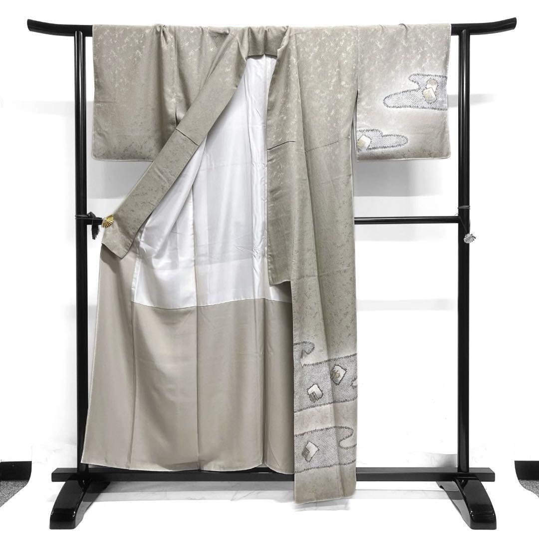 グレーの地に絞り調の鹿の子によるヱ霞と刺繍と金彩を交えて描かれた色紙に花模様がお洒落なデザインの一着です。
