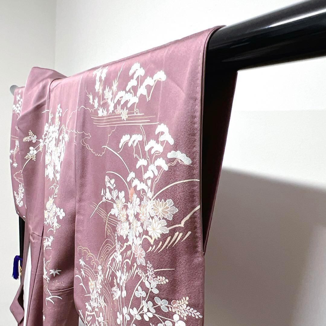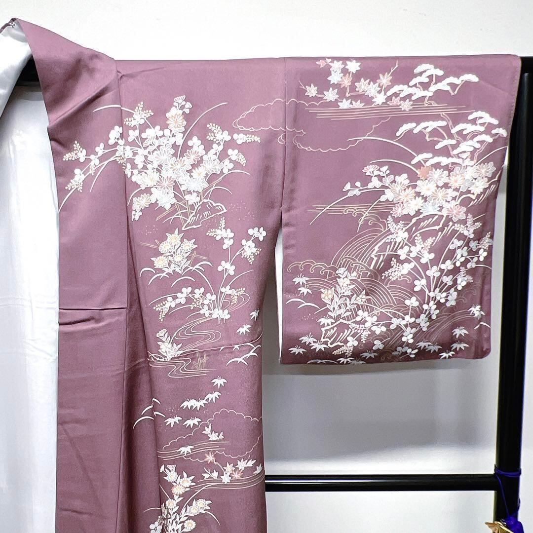 くすみのある赤紫色地に白を基調とした花模様に金駒刺繍があしらわれた風景模様が細やかで味わいのある一着となっております。