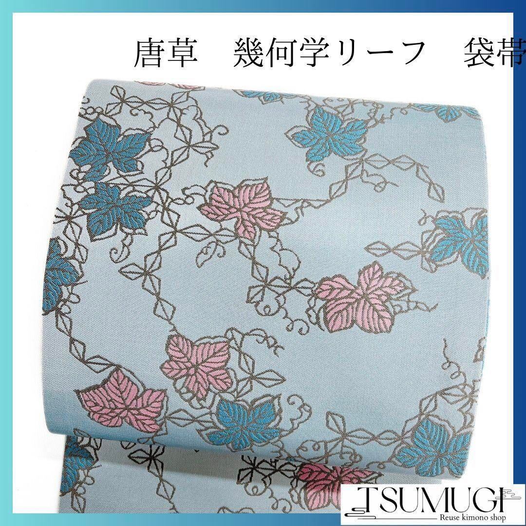 唐草模様や幾何学模様のリーフが織り出された袋帯です。