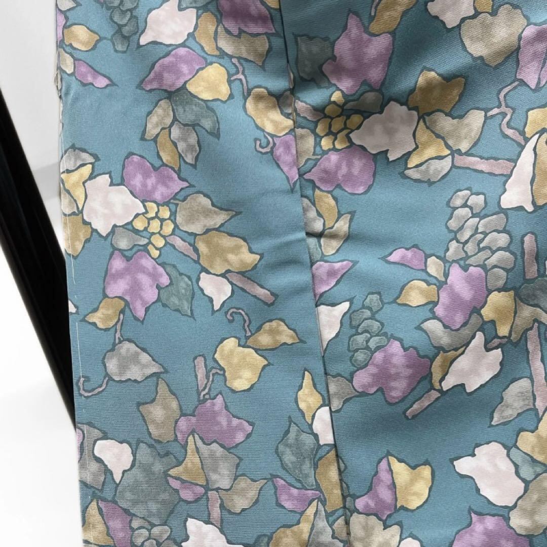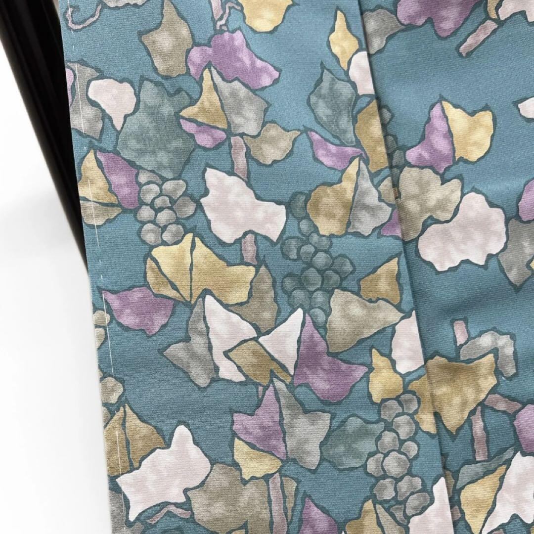ちりめんのナイルブルーの地に抽象的に描かれた葡萄にリーフの文様が目を惹くお洒落なデザインの一着です。