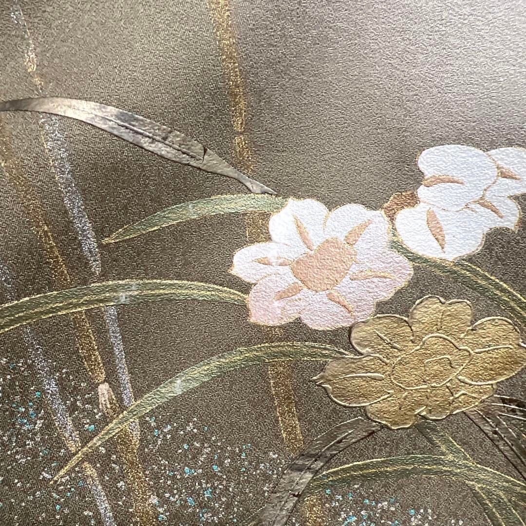 深いくすみブルーの地に刺繍で織られた鳥の文様に金彩を交えて描かれた牡丹や鉄線の花模様が華やかなデザインの一着です。