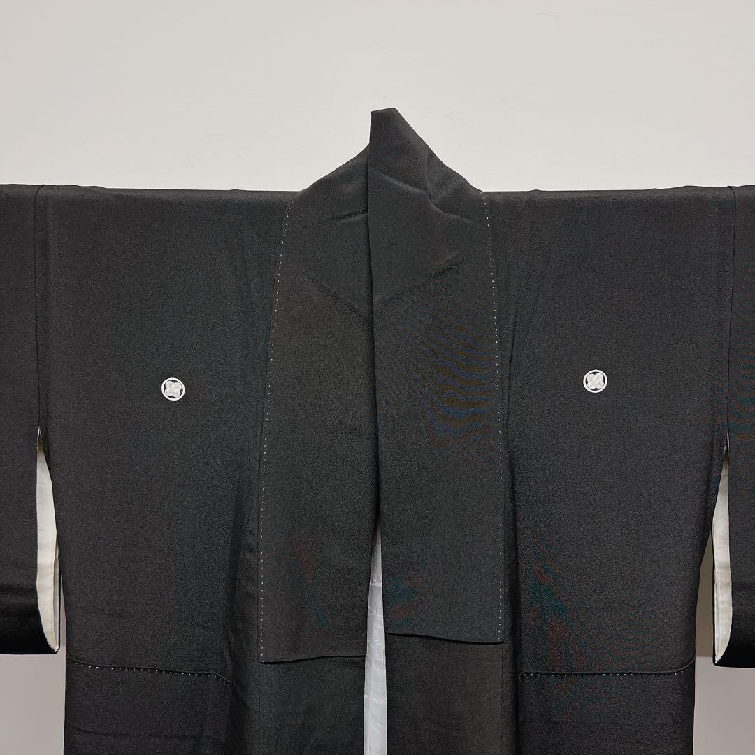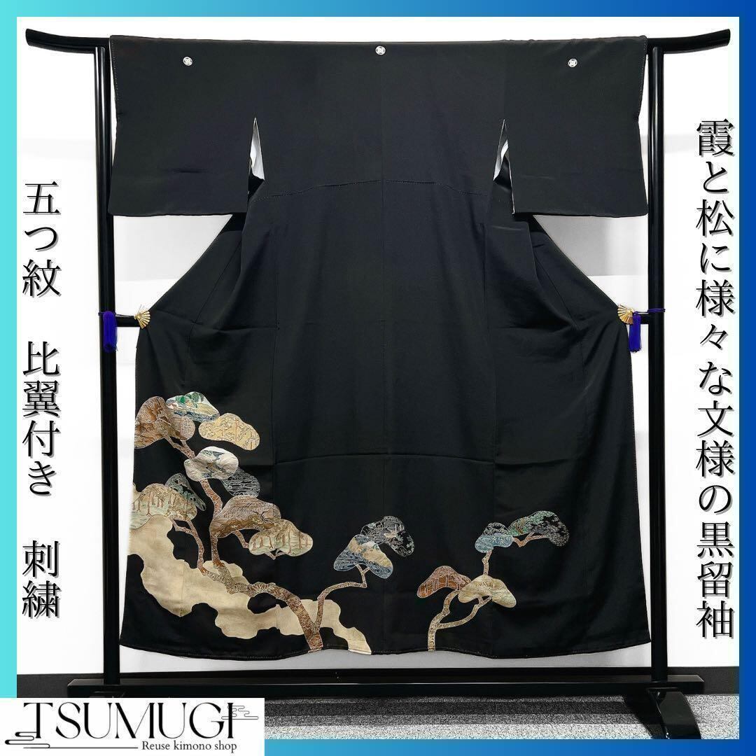 黒地に映える霞と松の中に刺繍を交えて松林や橋、水辺と舟など様々な文様が描かれた華やかで上品な一着です。