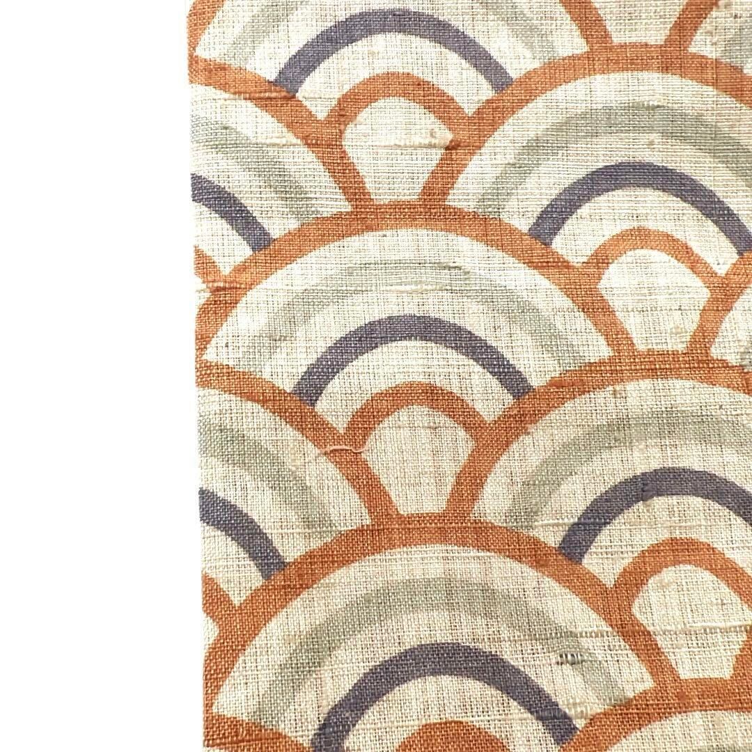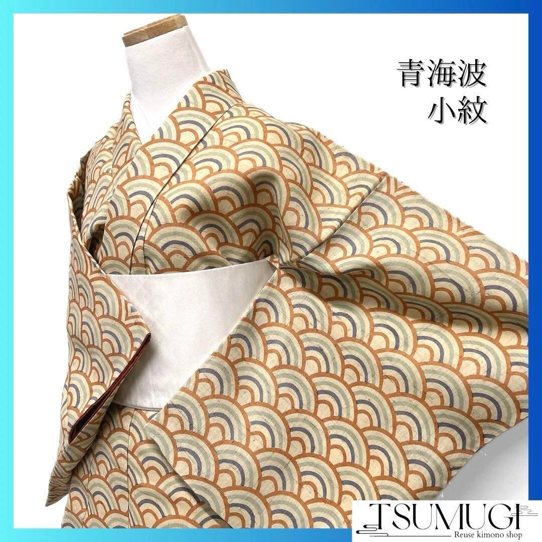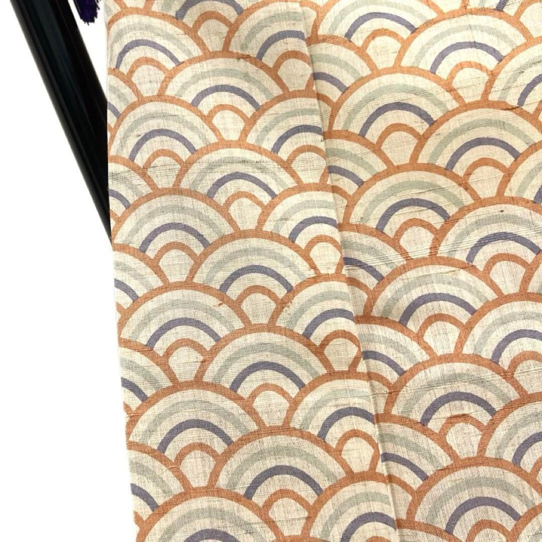 ベージュの地に織られたくすみカラーのオレンジ、ブルー、ライトブルーのカラフルな青海波の文様がお洒落なデザインの一着です。