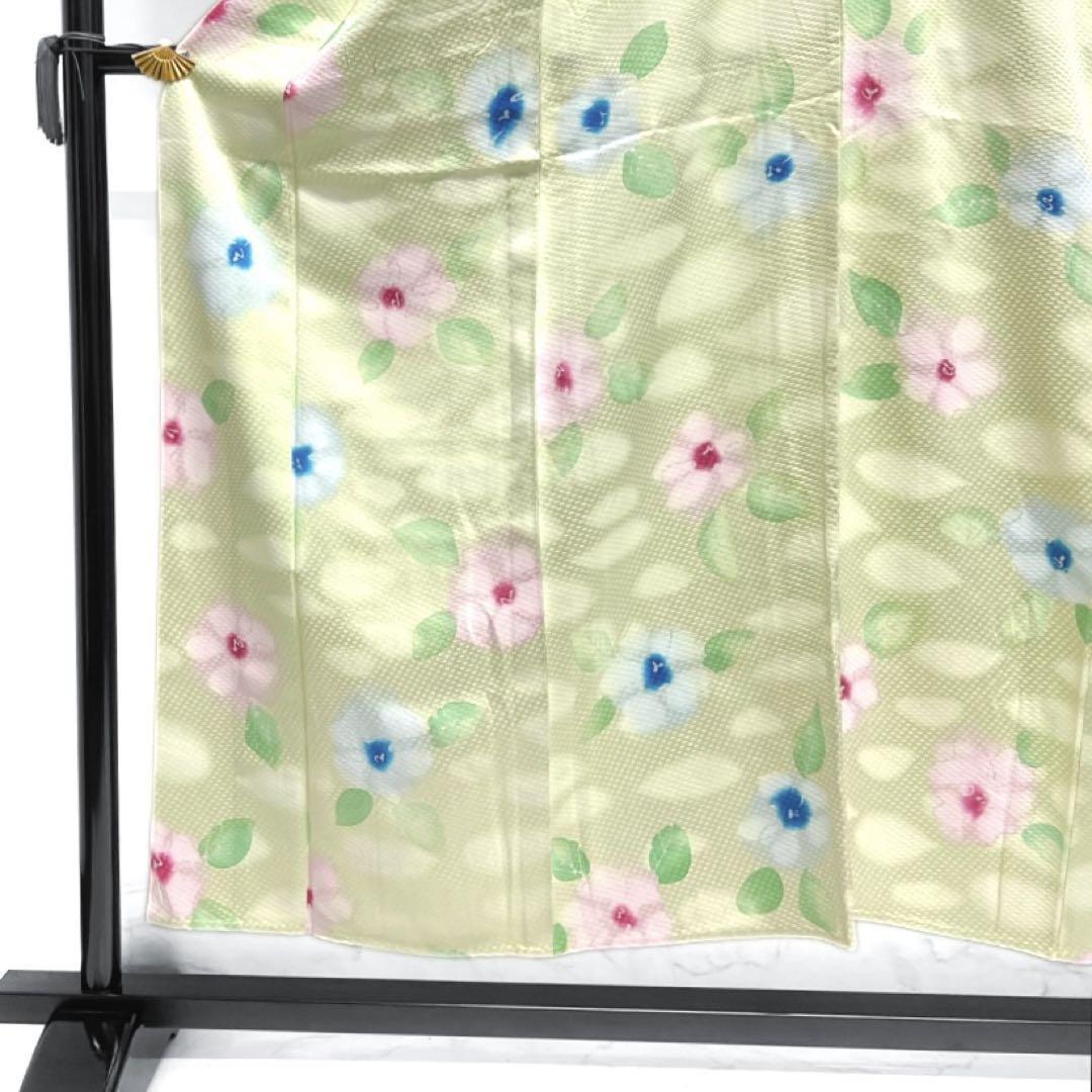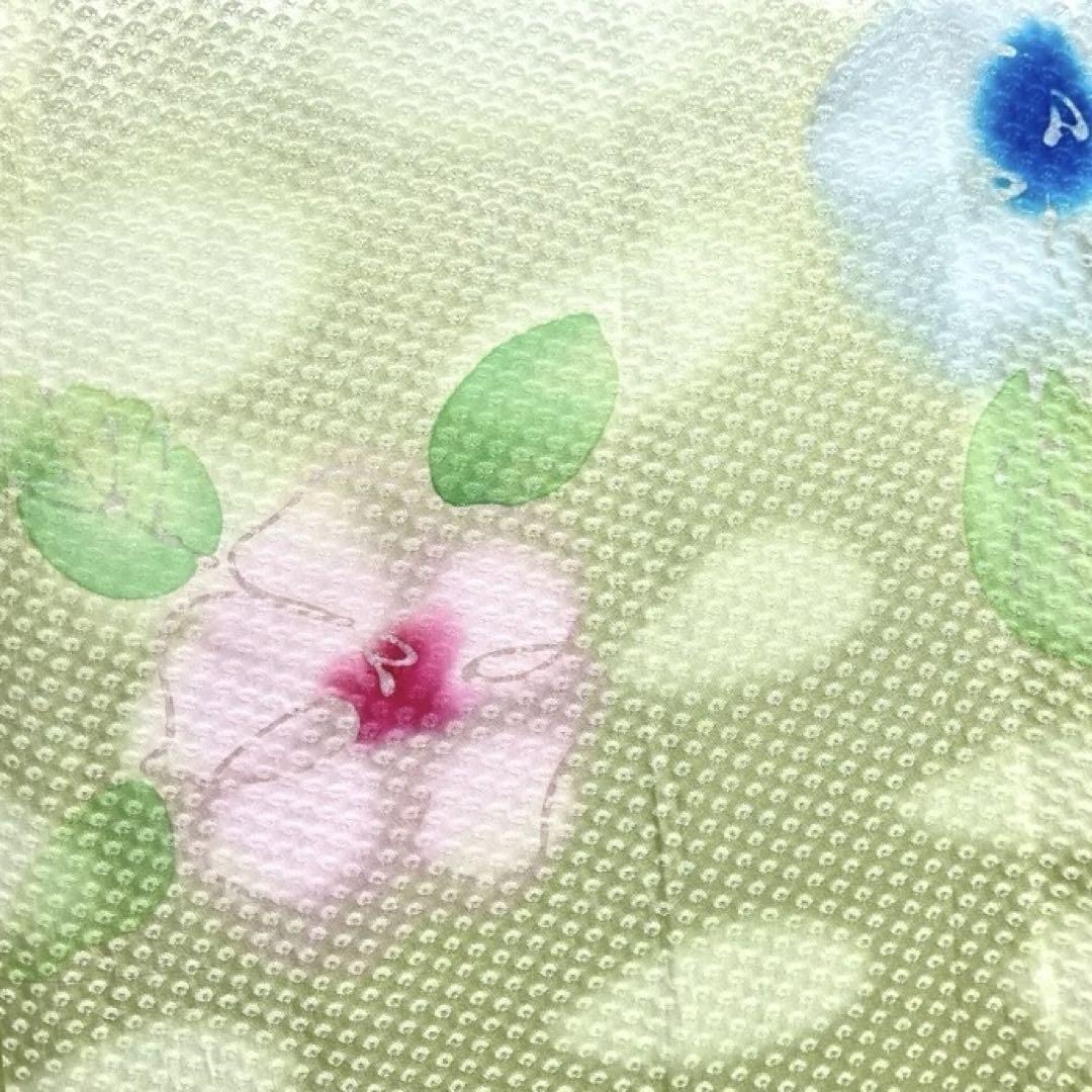 鹿の子地紋にくすみのあるライトグリーンにピンクとライトブルーの花模様が目を惹くお洒落なデザインの一着です。