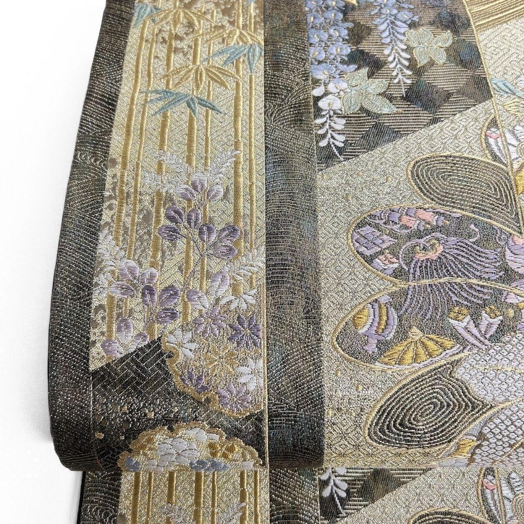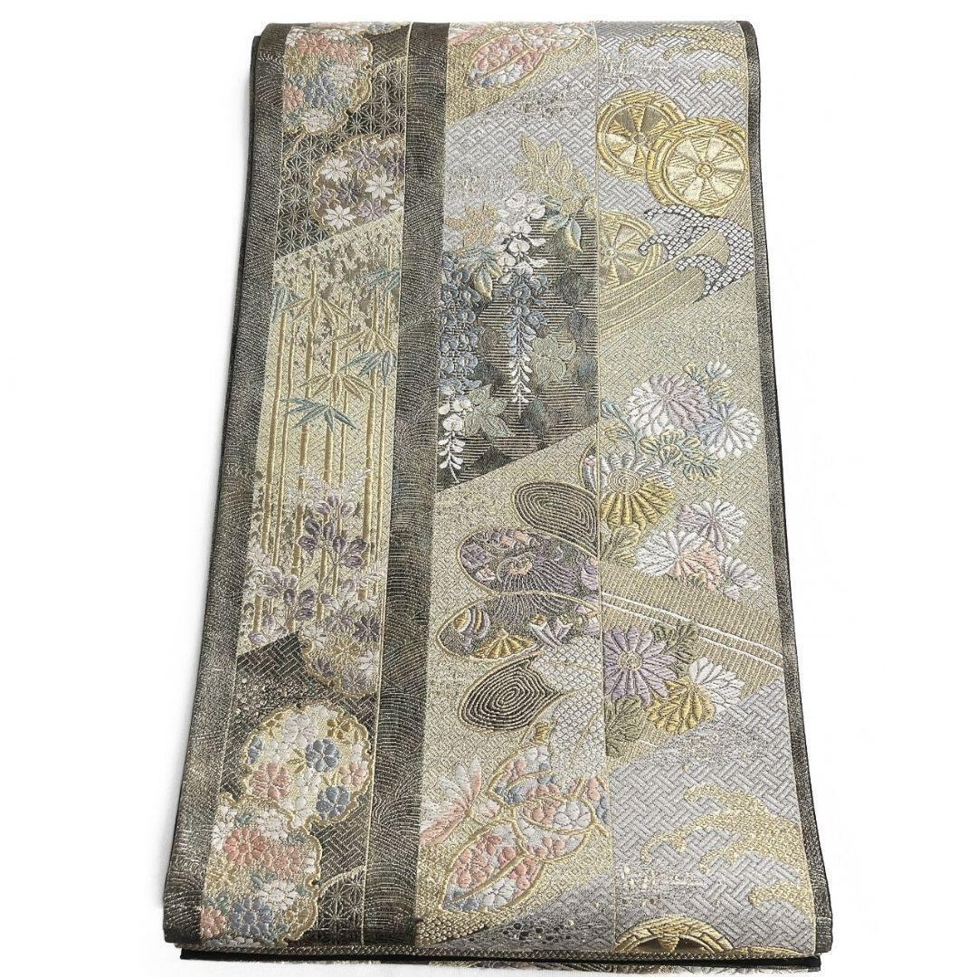 縦縞に雪輪や藤の花、菊花、麻の葉模様が織り出された袋帯です。