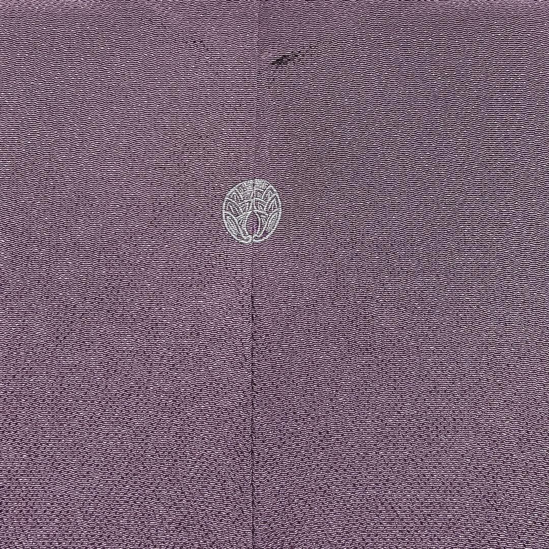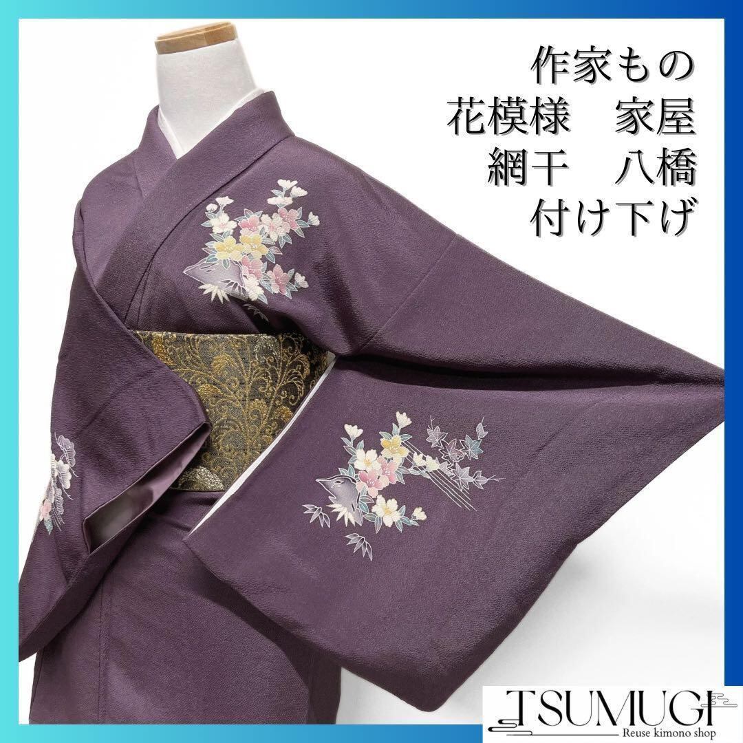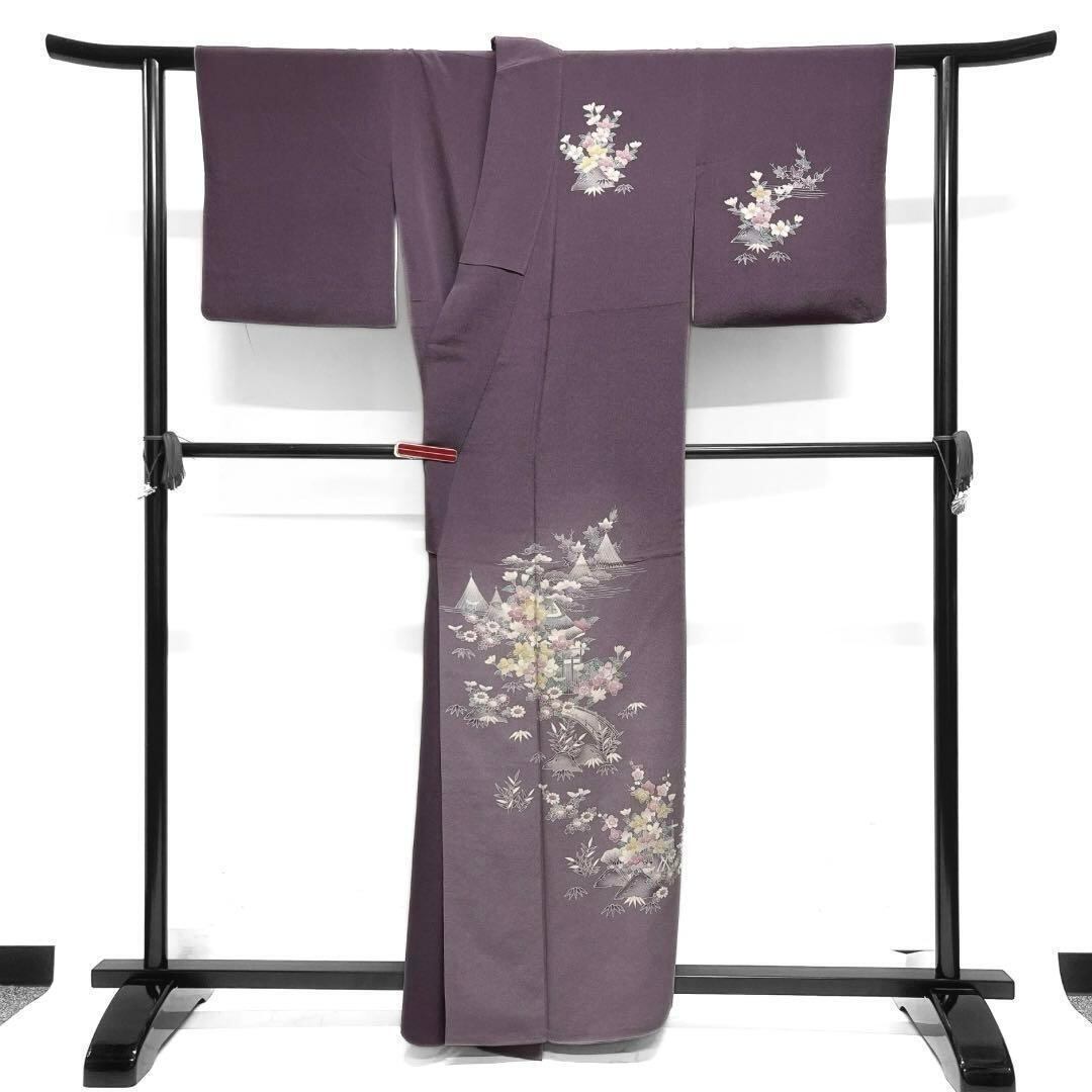 紫の地に様々な花模様と家屋に八橋、網干が描かれた華やかな一着です