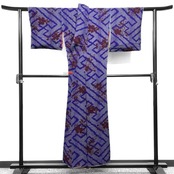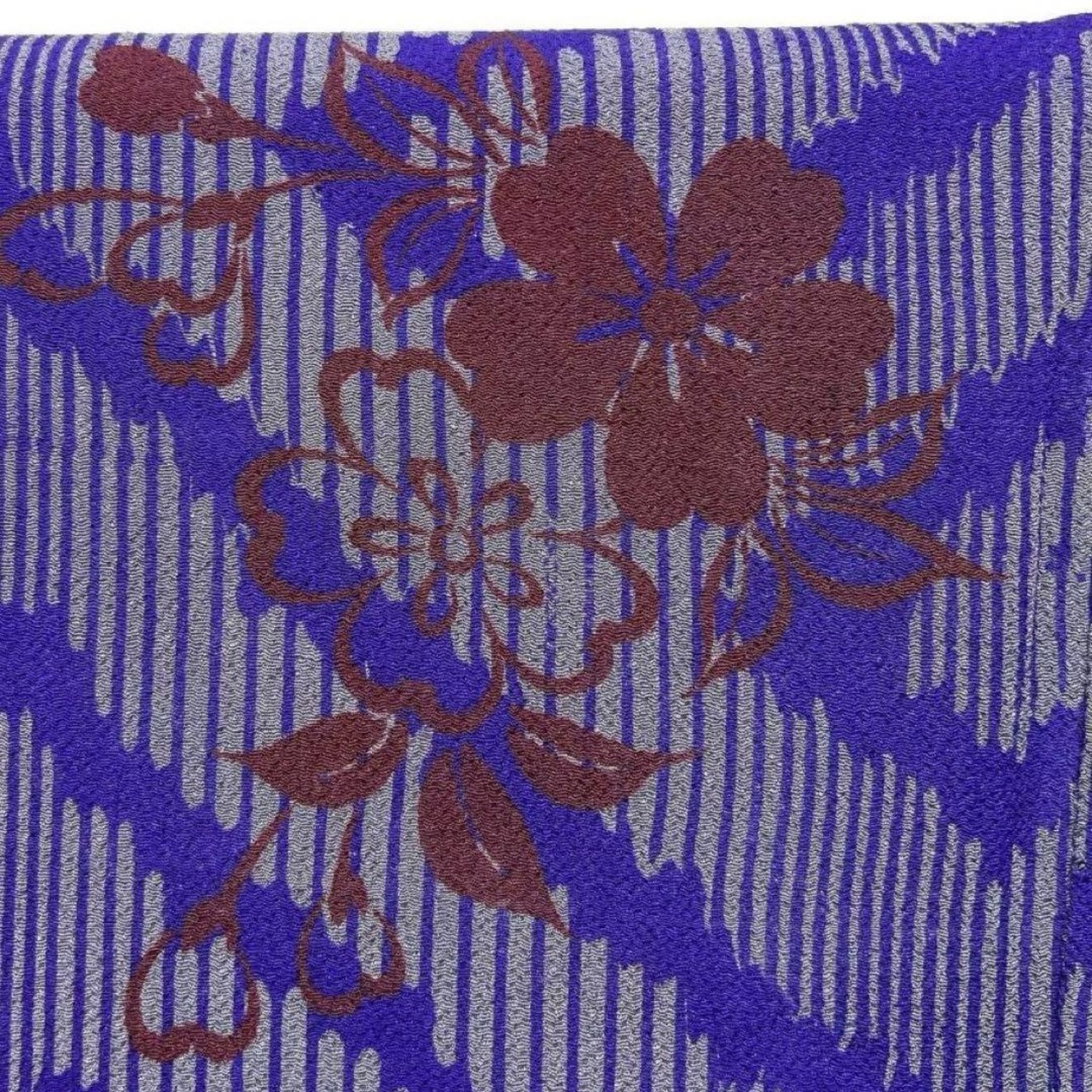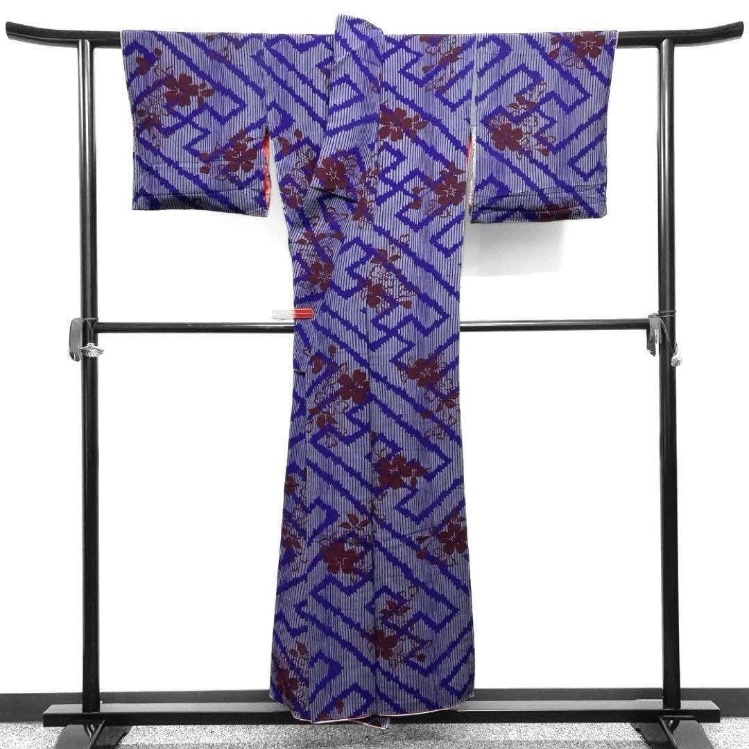青紫とグレーで描かれた縦縞に大きな紗綾形と深いブラウンで織られた桜花の文様がお洒落な一着です。