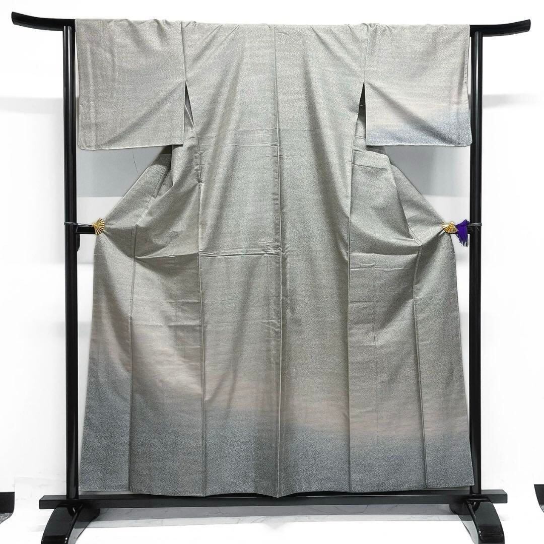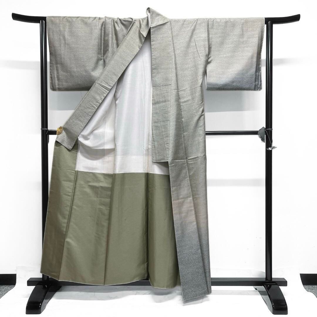 金通しにたたき染の染大島紬地に薄いグリーンのグラデーションの文様がお洒落なデザインの一着です。