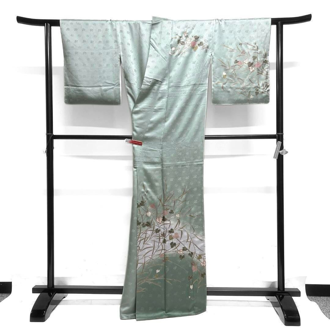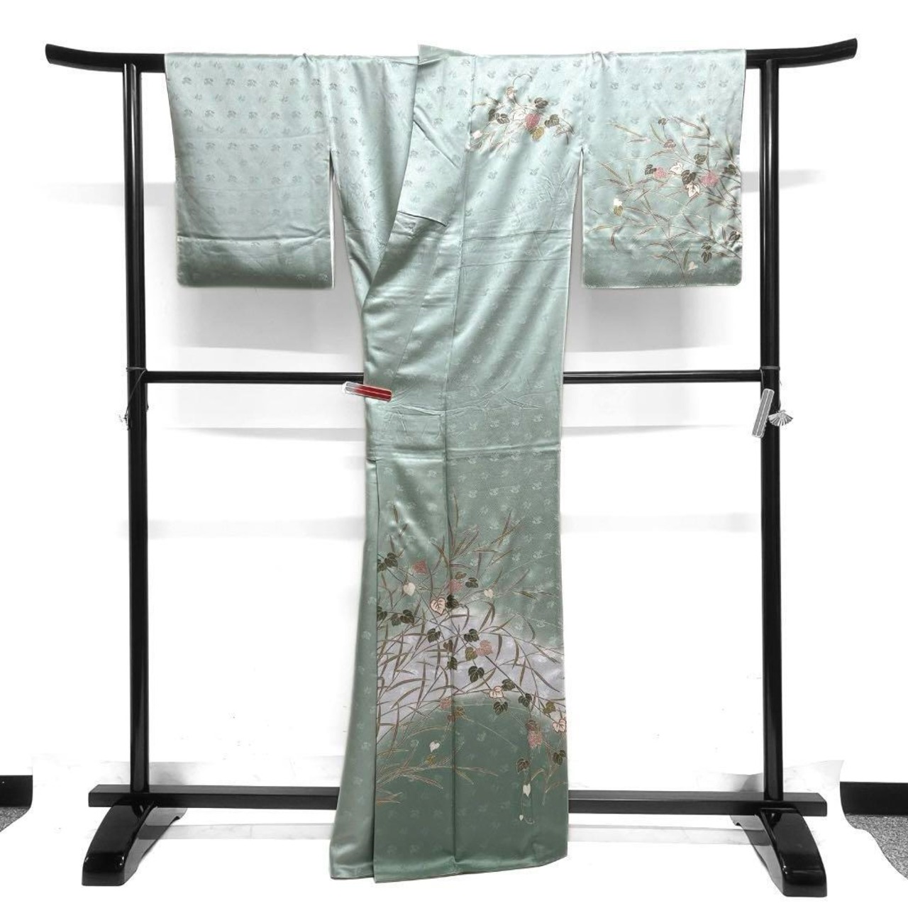 くすみのある薄いグリーンの花紗綾形地紋に金彩で縁取られた竹にリーフと蔦の文様が華やかなデザインの一着です。