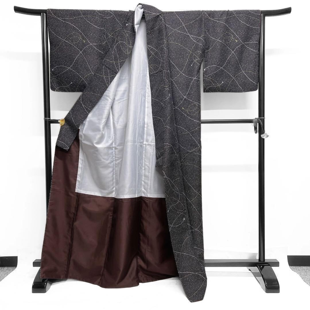 黒地にドットの文様と水引の文様が描かれたお洒落なデザインの一着です。