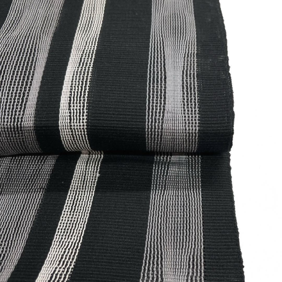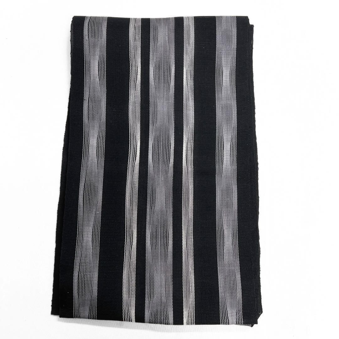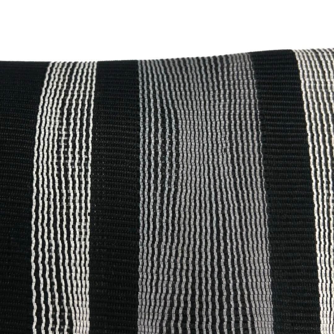 黒地に白とグレーのモノトーンで織られた縦縞とたよろけ縞の文様がお洒落なデザインの一着です。