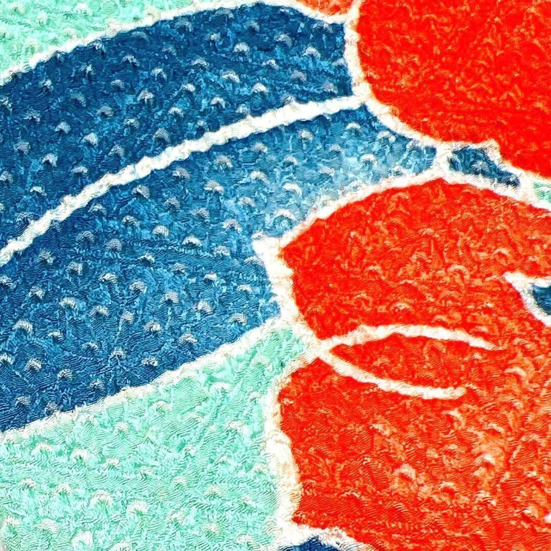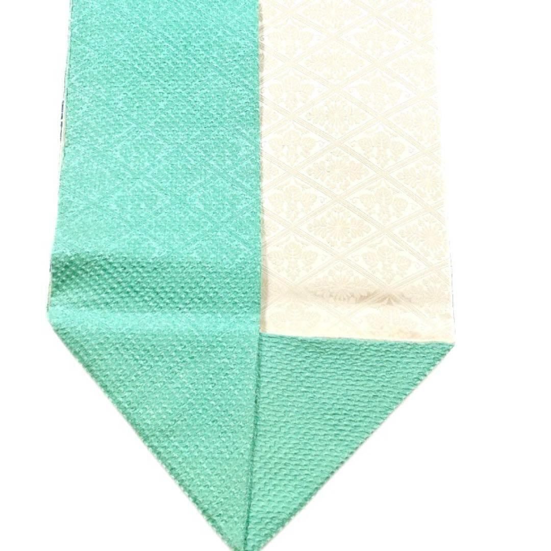 明るい色味のピーコックグリーン地の総絞りに朱色と青の椿文様が目を惹く華やかな一着です。