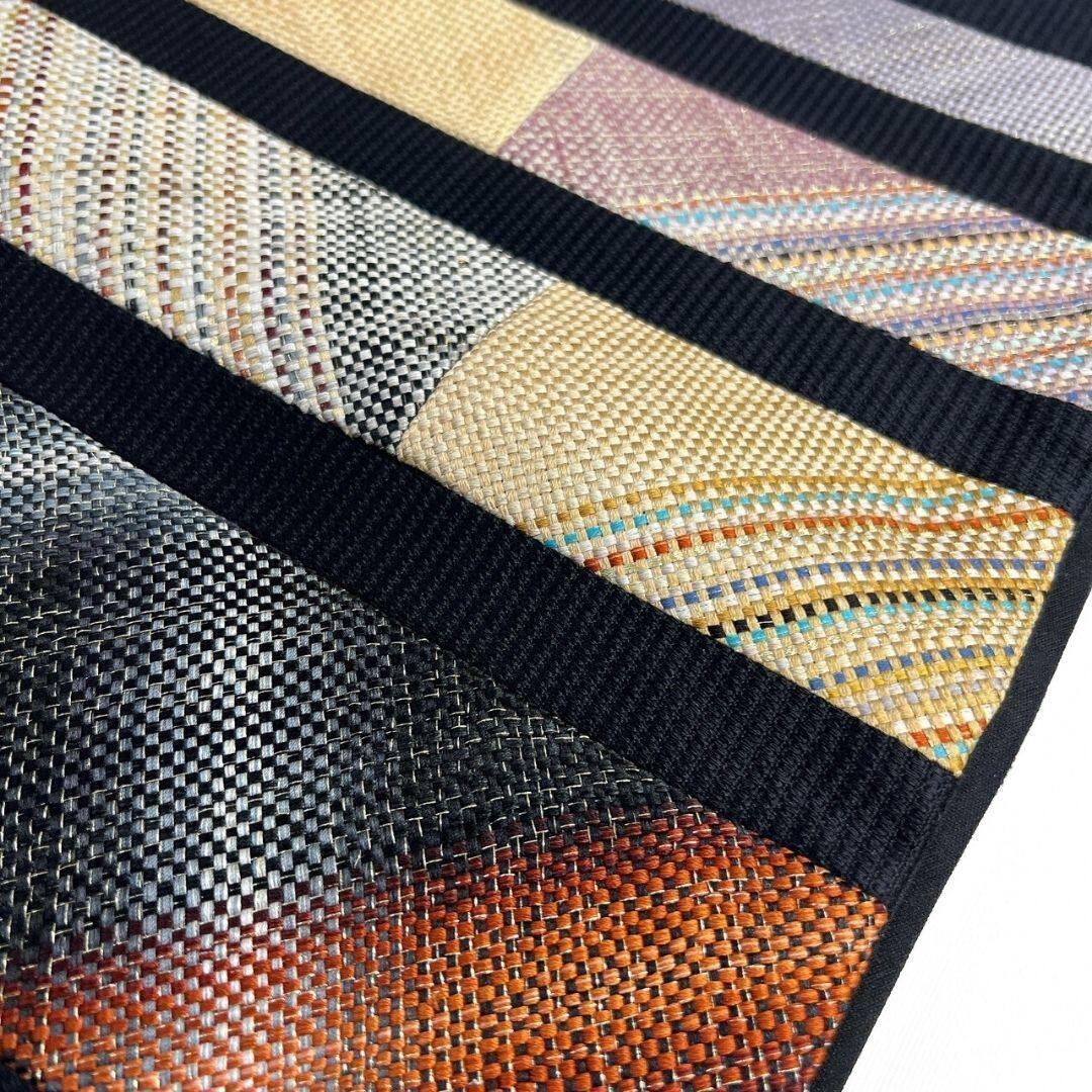 横段に格子模様が金糸を交え織り出された袋帯です。
