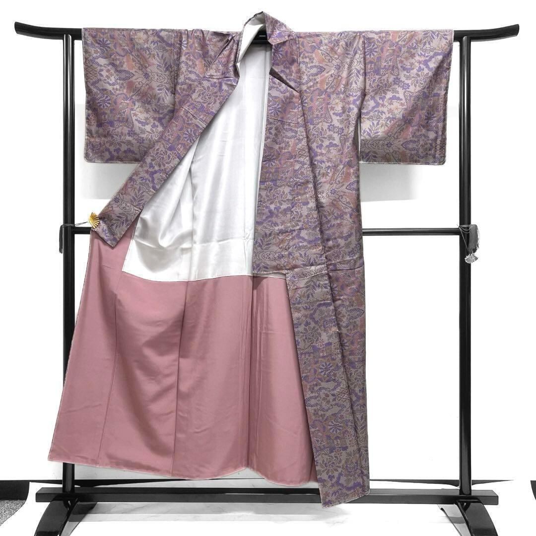 紫の大島紬地に御所車や唐花、松、小花に抽象模様が織られたお洒落なデザインの一着です。