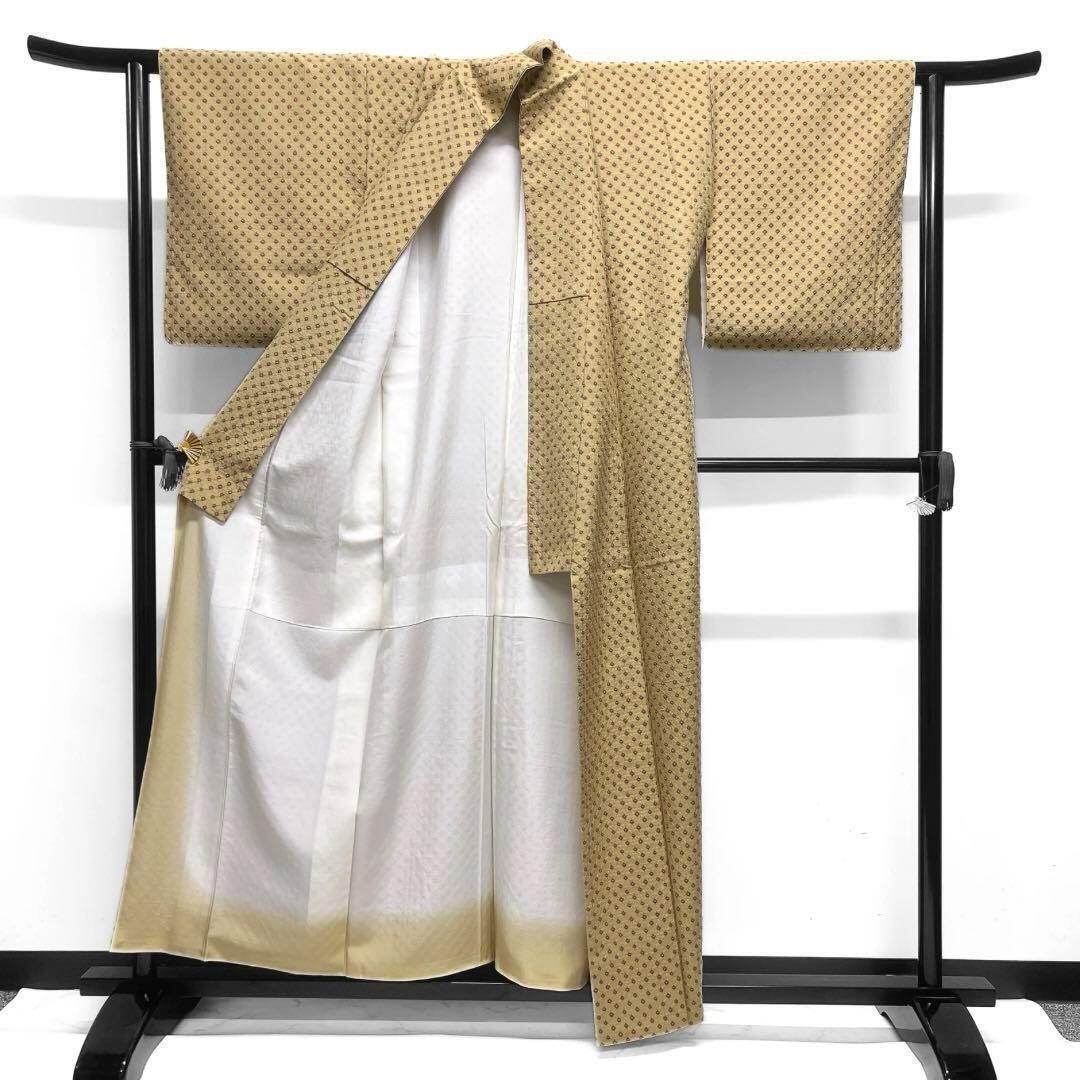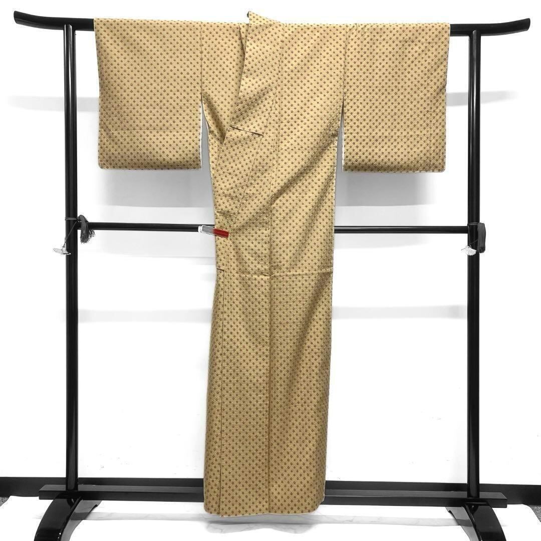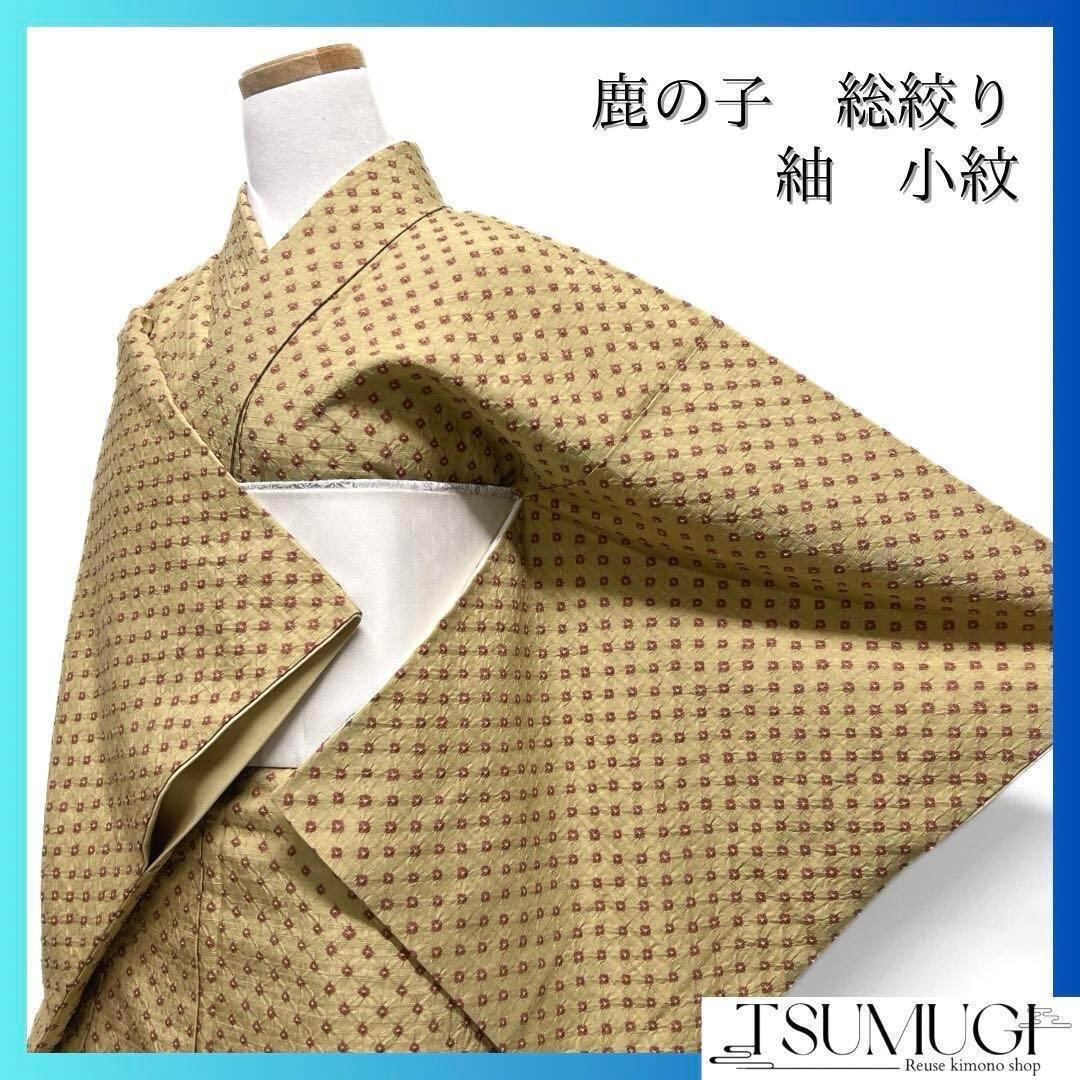 くすんだ深い黄色の紬地に総絞りの赤で描かれた鹿の子がお洒落な一着です。