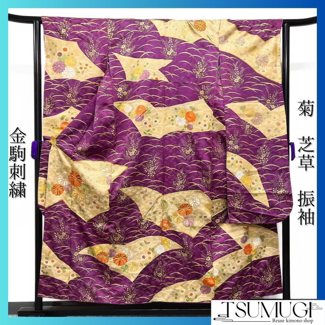 紫色地に金彩の芝草と花模様に金駒刺繍と刺繍を交えた菊の花模様が華やかで絢爛な雰囲気の一着です。