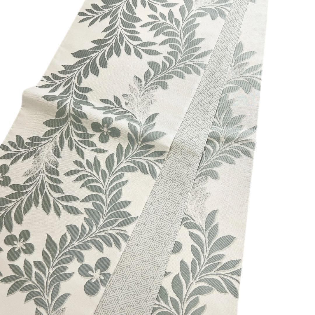 白地にグレーに近い薄い緑で縦に織られたリーフと花模様が華やかな一着です。