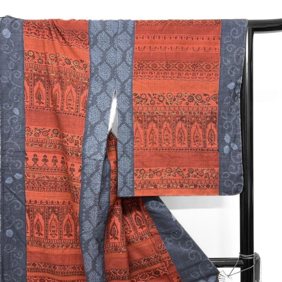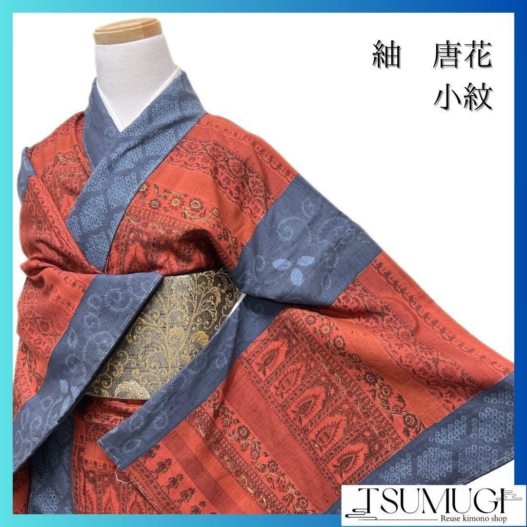 くすみブルーと赤、細やかな唐花模様が可愛らしいデザインの一着です。