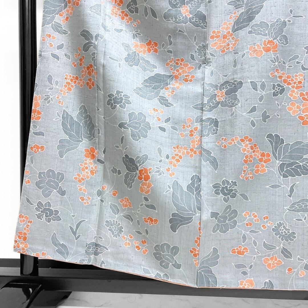 淡いブルーに鮮やかなオレンジの花弁が華やかな印象の1着です。