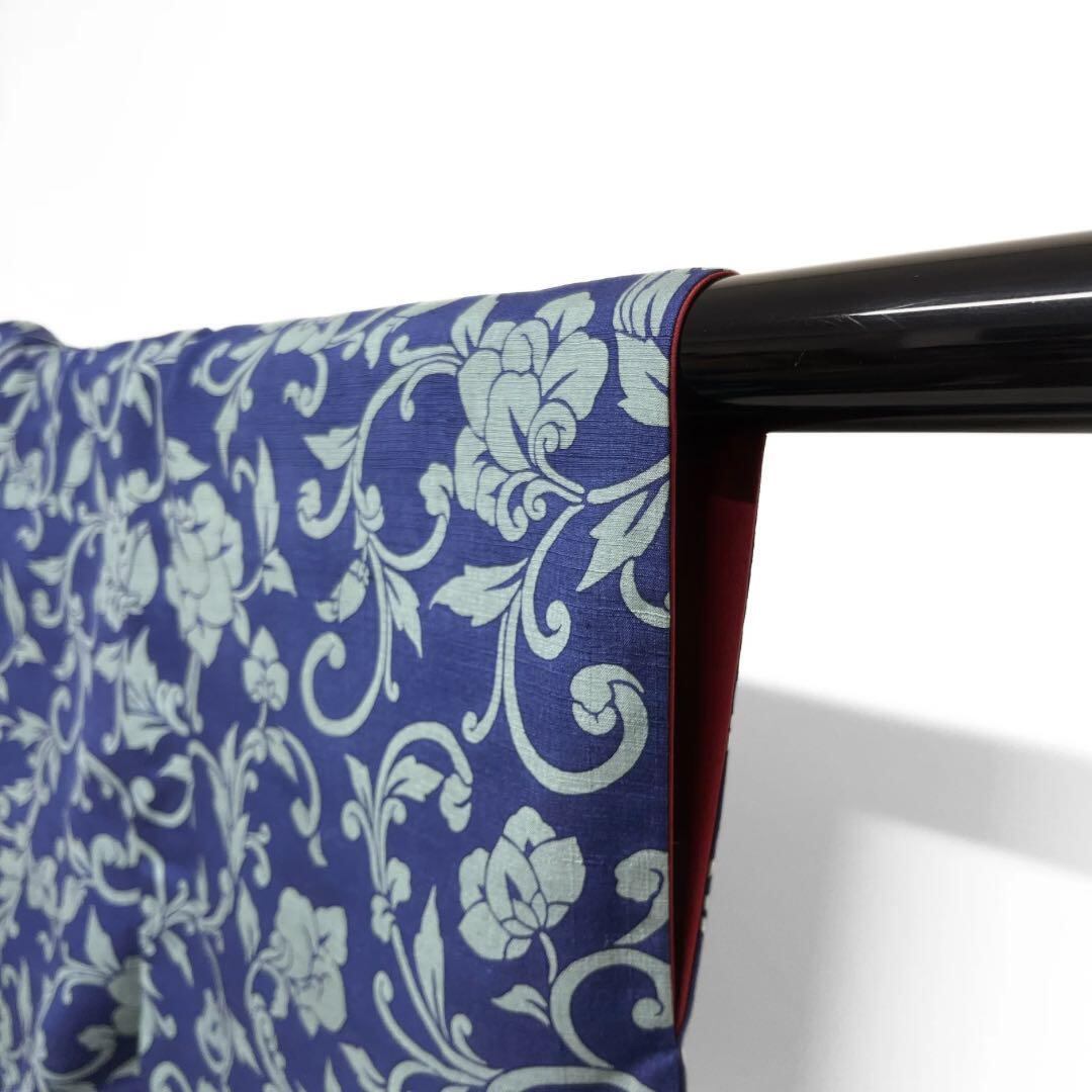 ブルーの紬の地に唐草花の文様が描かれたお洒落なデザインの一着です。