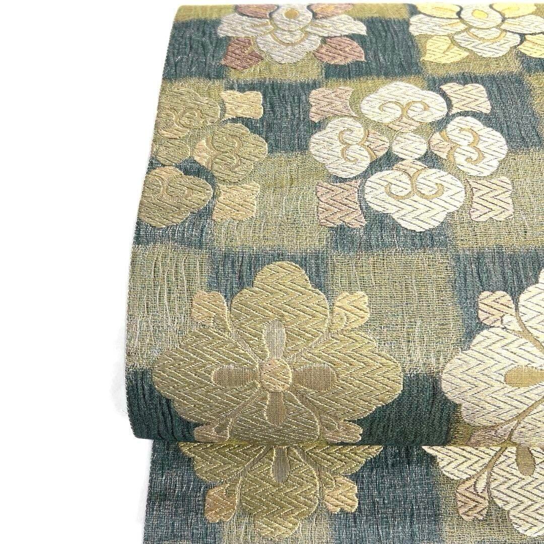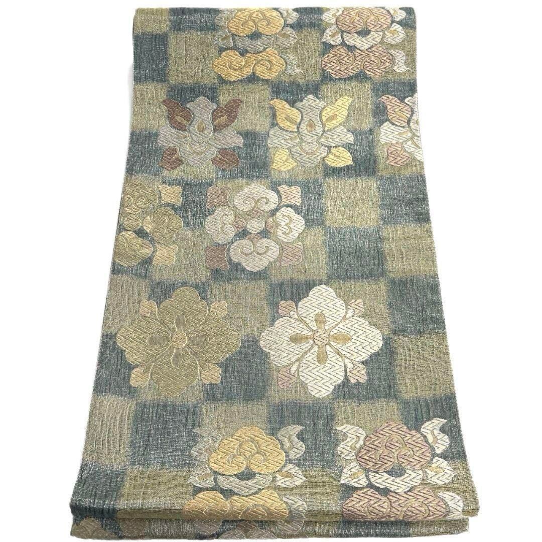 市松模様のよろけ織りに唐織の花紋が金糸と銀糸とともにおり交えられた一着です。