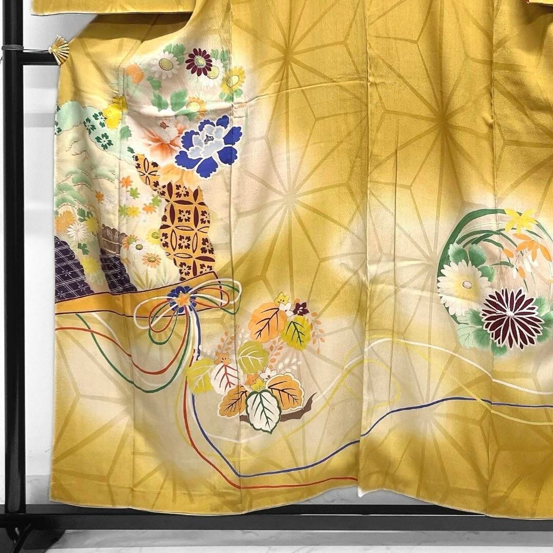 麻の葉地紋の深いくすみイエローの地に刺繍を交えて描かれた花模様と扇に水引と伝統和模様が華やかなデザインの一着です。