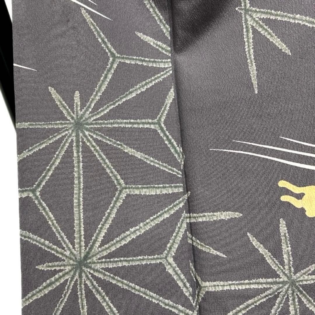 グレーの地に描かれた麻の葉文様と駆け回るうさぎの文様がお洒落なデザインの一着です。