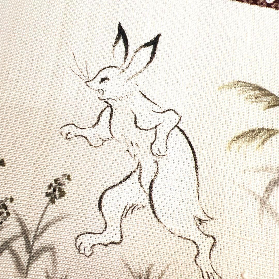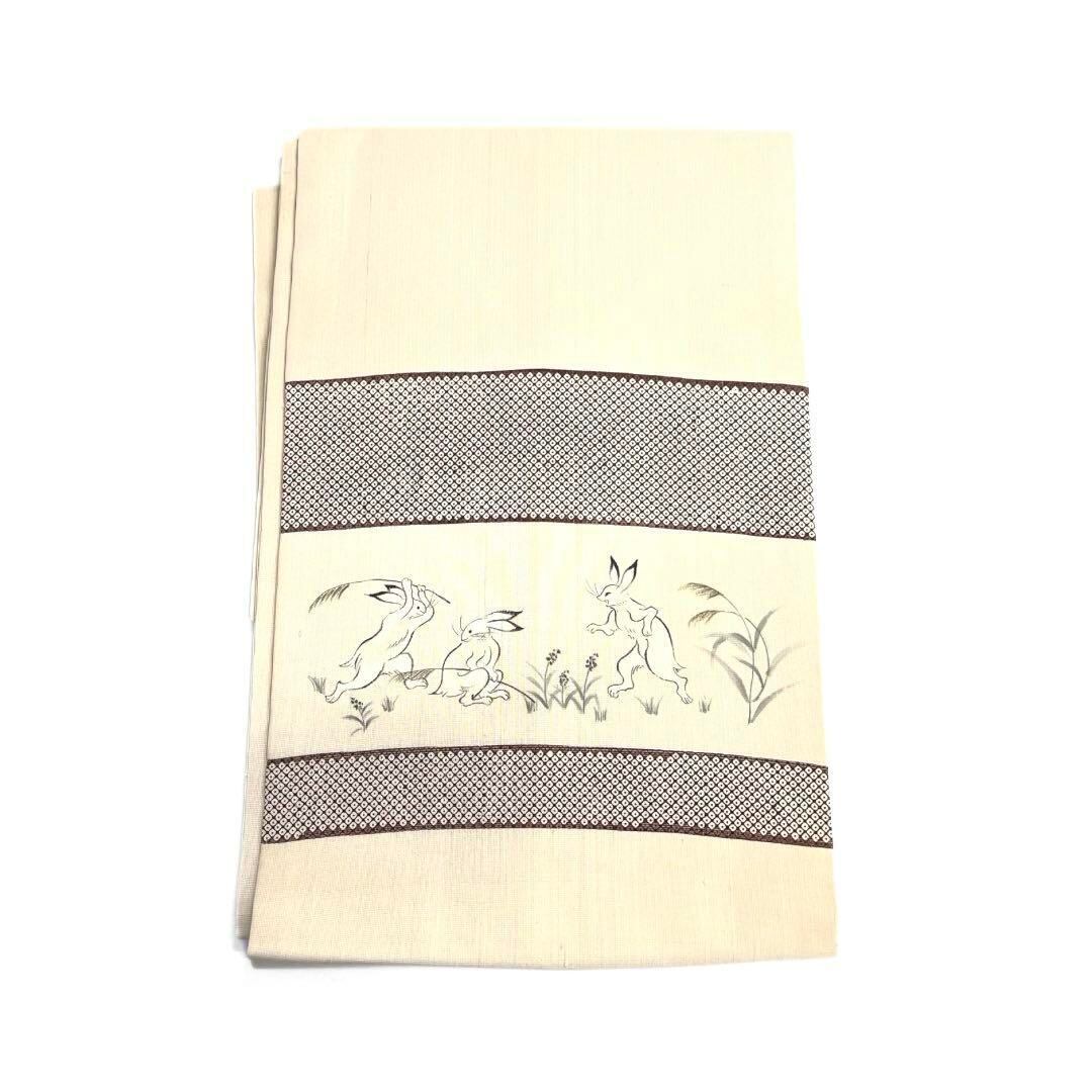 紬のベージュの地に鳥獣戯画の兎が描かれた可愛らしいお洒落なデザインの一着です。