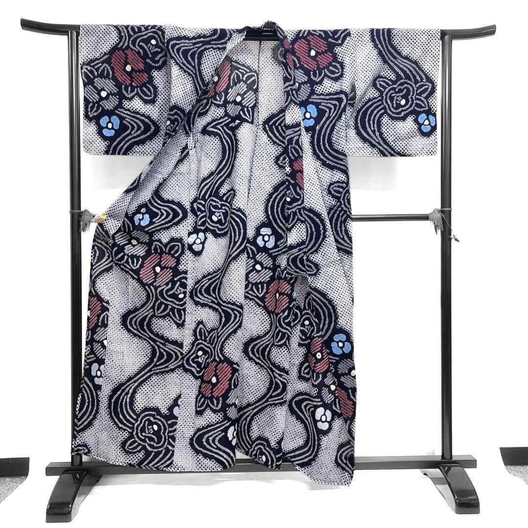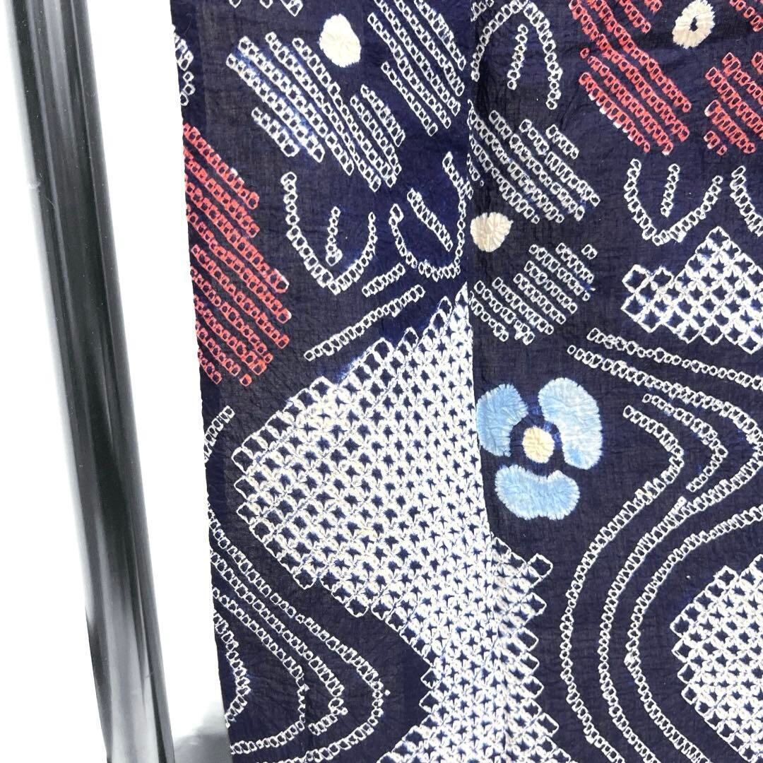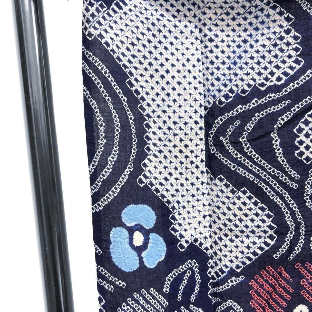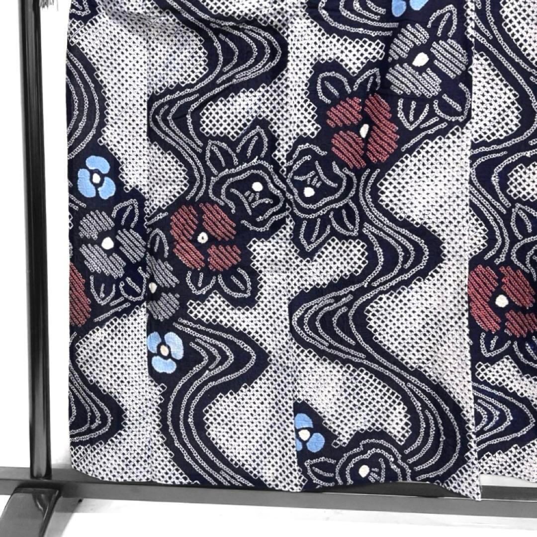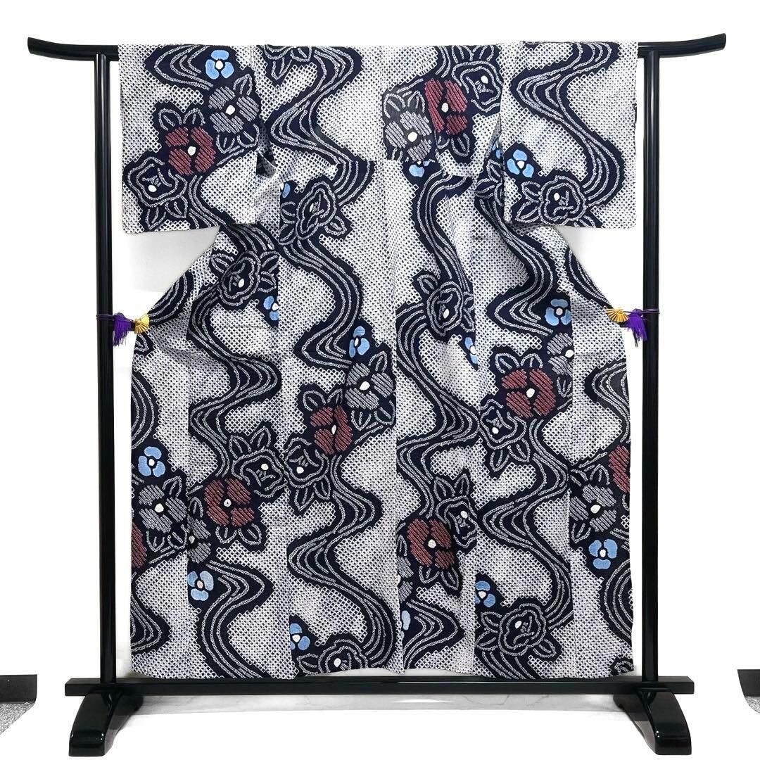 藍染の深いネイビーの地に細やかな絞りで描かれた流水に椿の文様が華やかなデザインの一着になります。