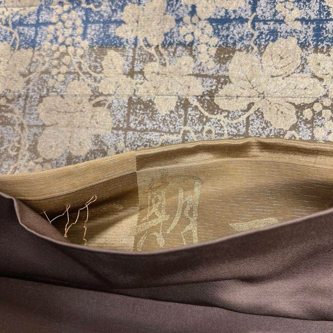横段に芝草や葡萄、花紋が金彩を交え織り出された一着です。