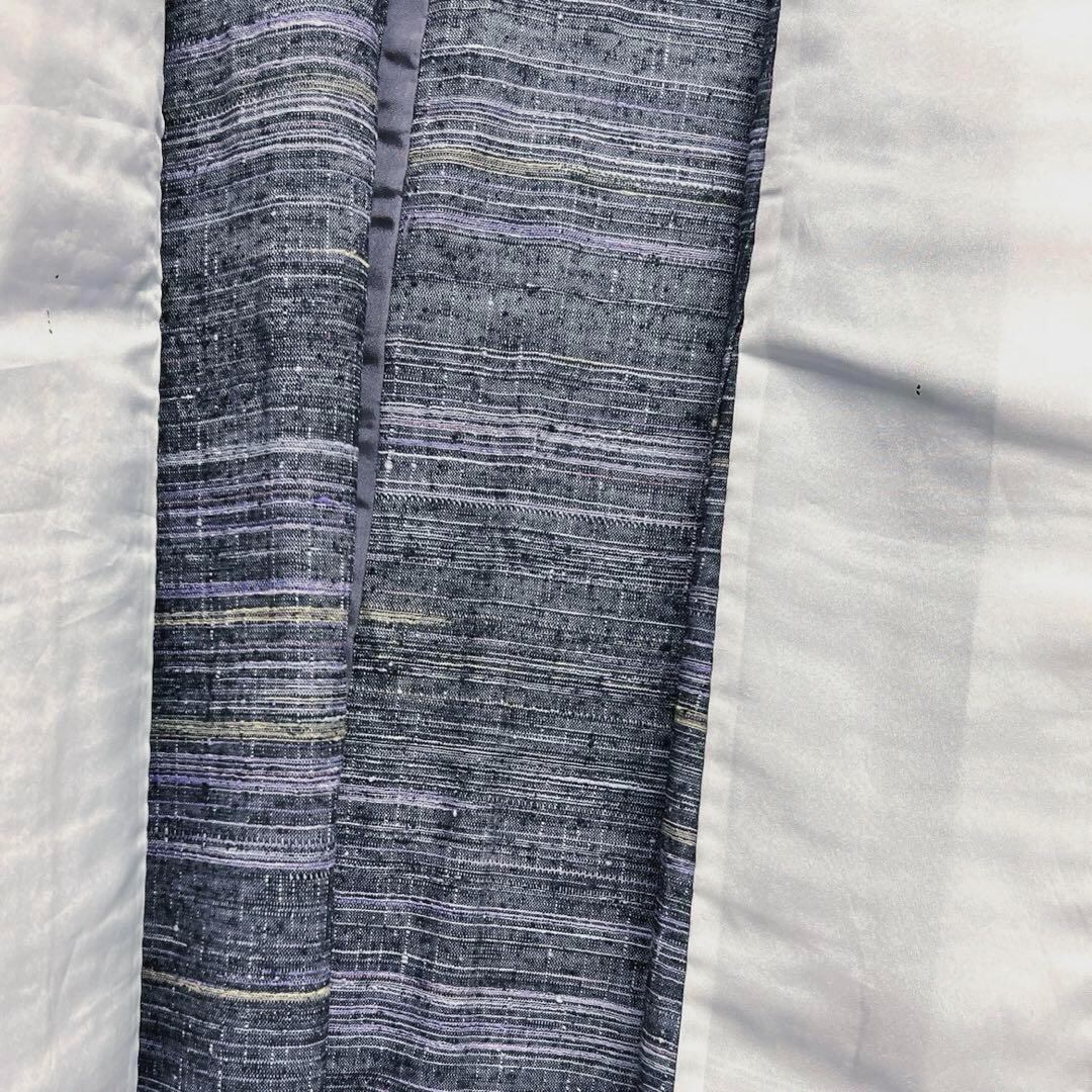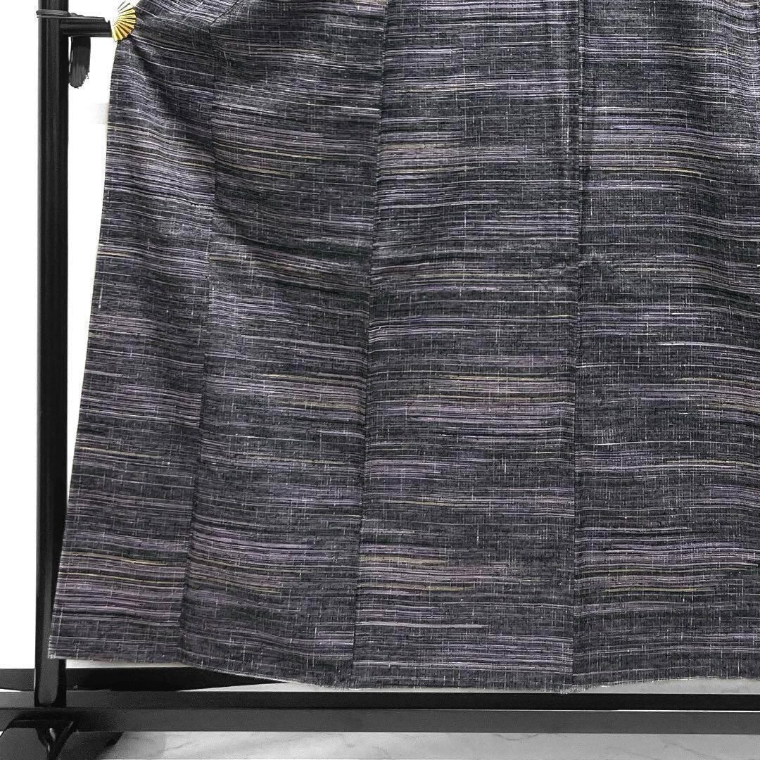 紬で織られたグレーや紫、黄色の横縞模様がお洒落な一着です。